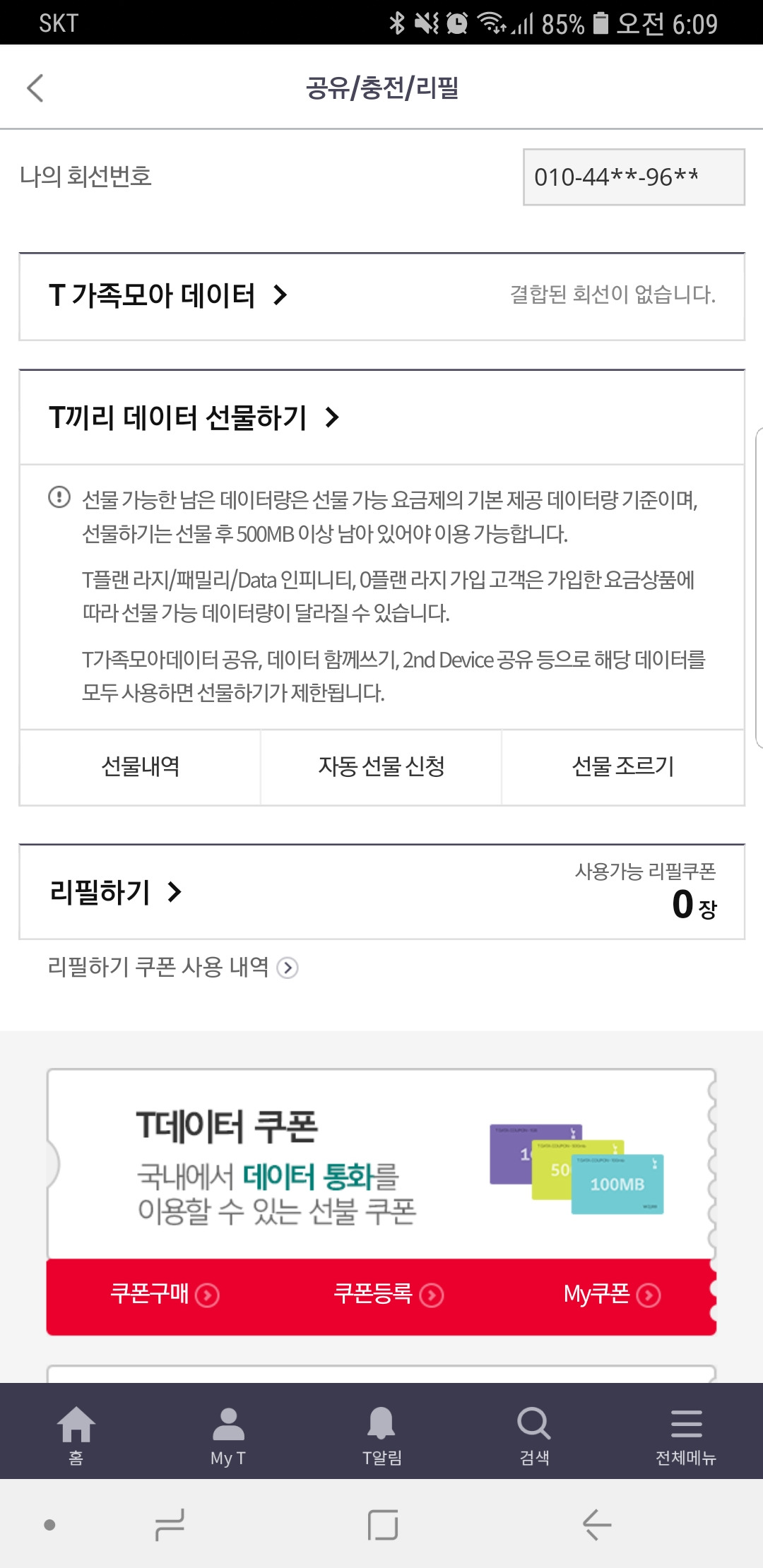 마지막으로, T가족모아데이터도 확인해 본다. 결론은 가족에게 엄청 많이 데이터를 공유할 수 있다는 것이다.