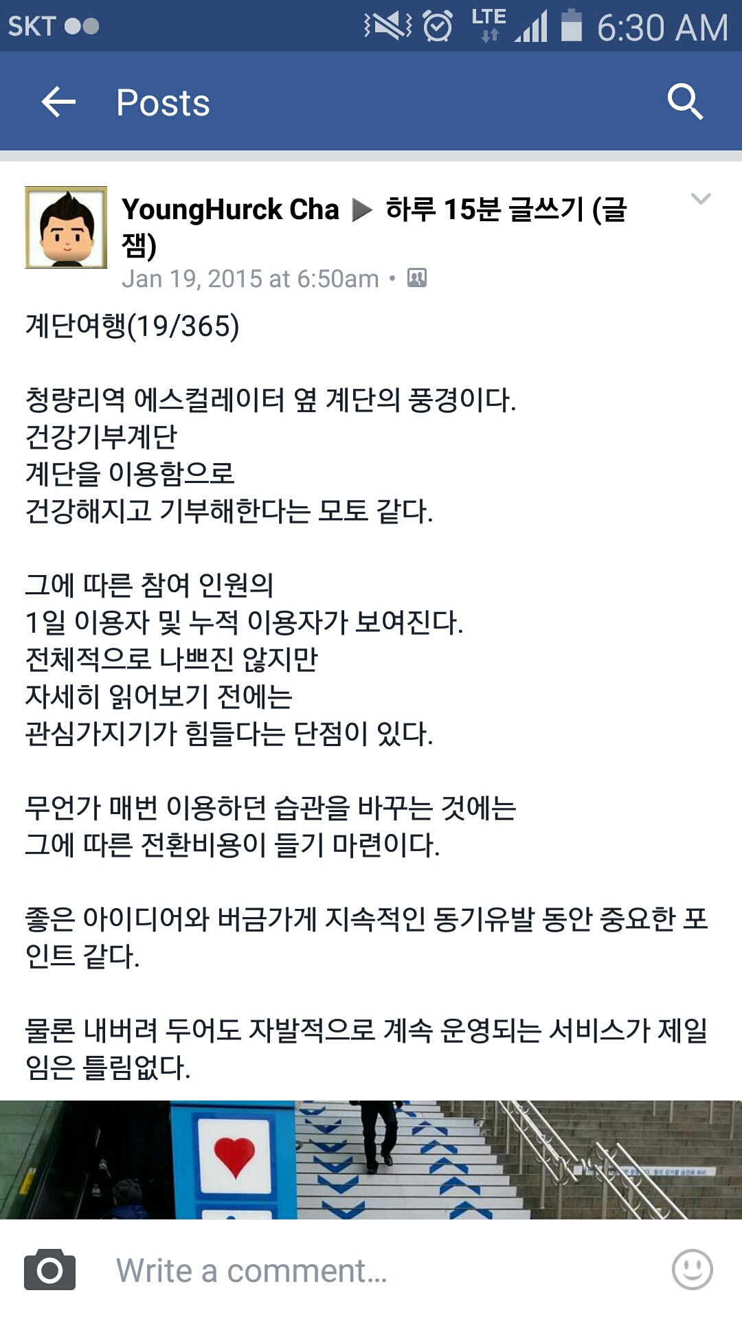작년인가도 글쓰기 SNS에 언급한 건강계단이다. 작년 글쓰기 주제가 여행이라 계단여행으로 몀먕했던 기억이 난다. 작년은 동기유발, 행동유추에 대하여 이야기 했다.