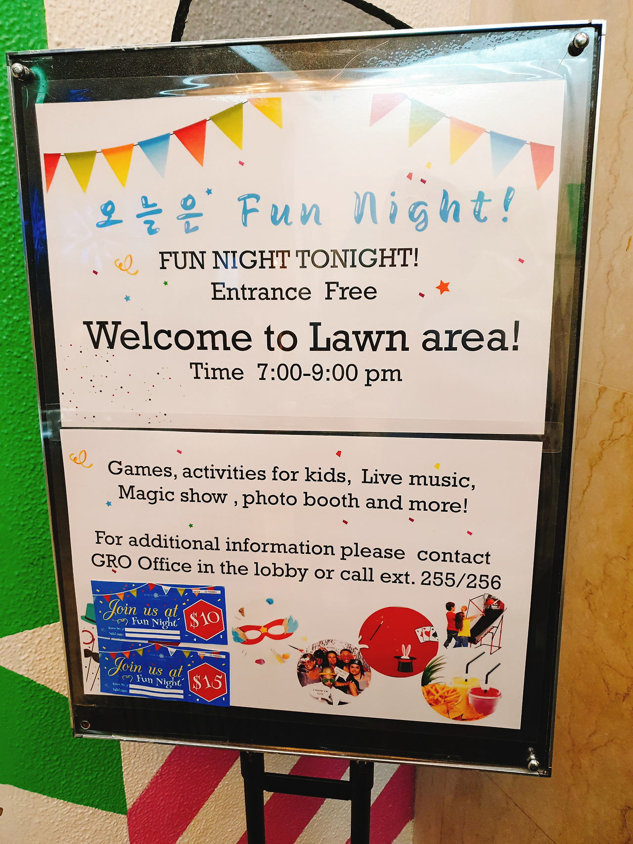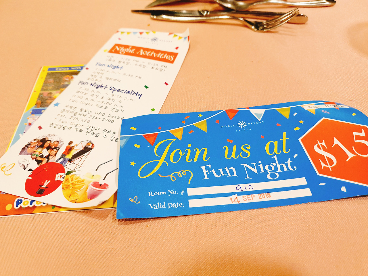 저녁마다 행사가 있다. 펀 나이트 무료로 참석할 수 있는 쿠폰을 받았다. 15불 상당의 입장료였다.
