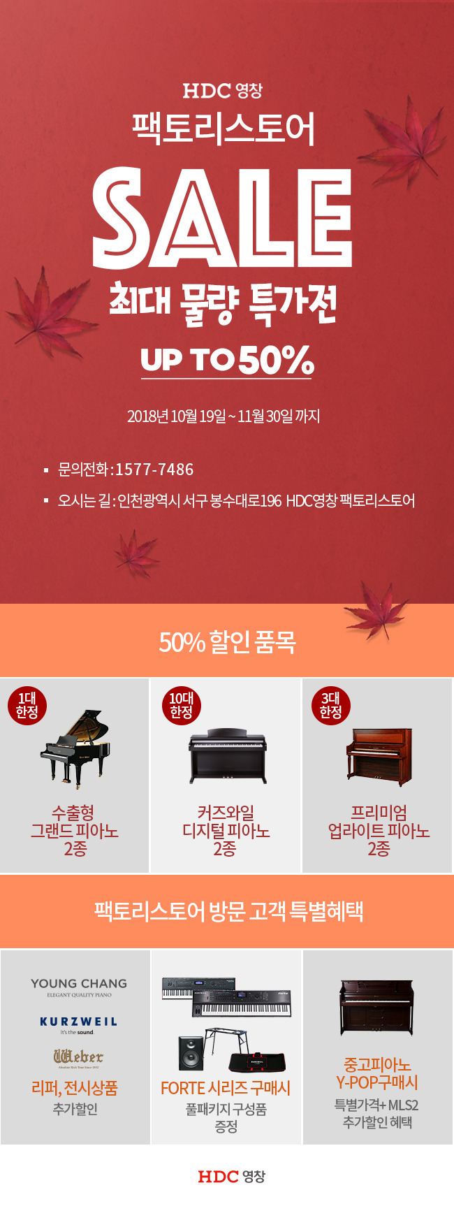 그랜드피아노와 중고피아노의 반값 할인 행사이다.