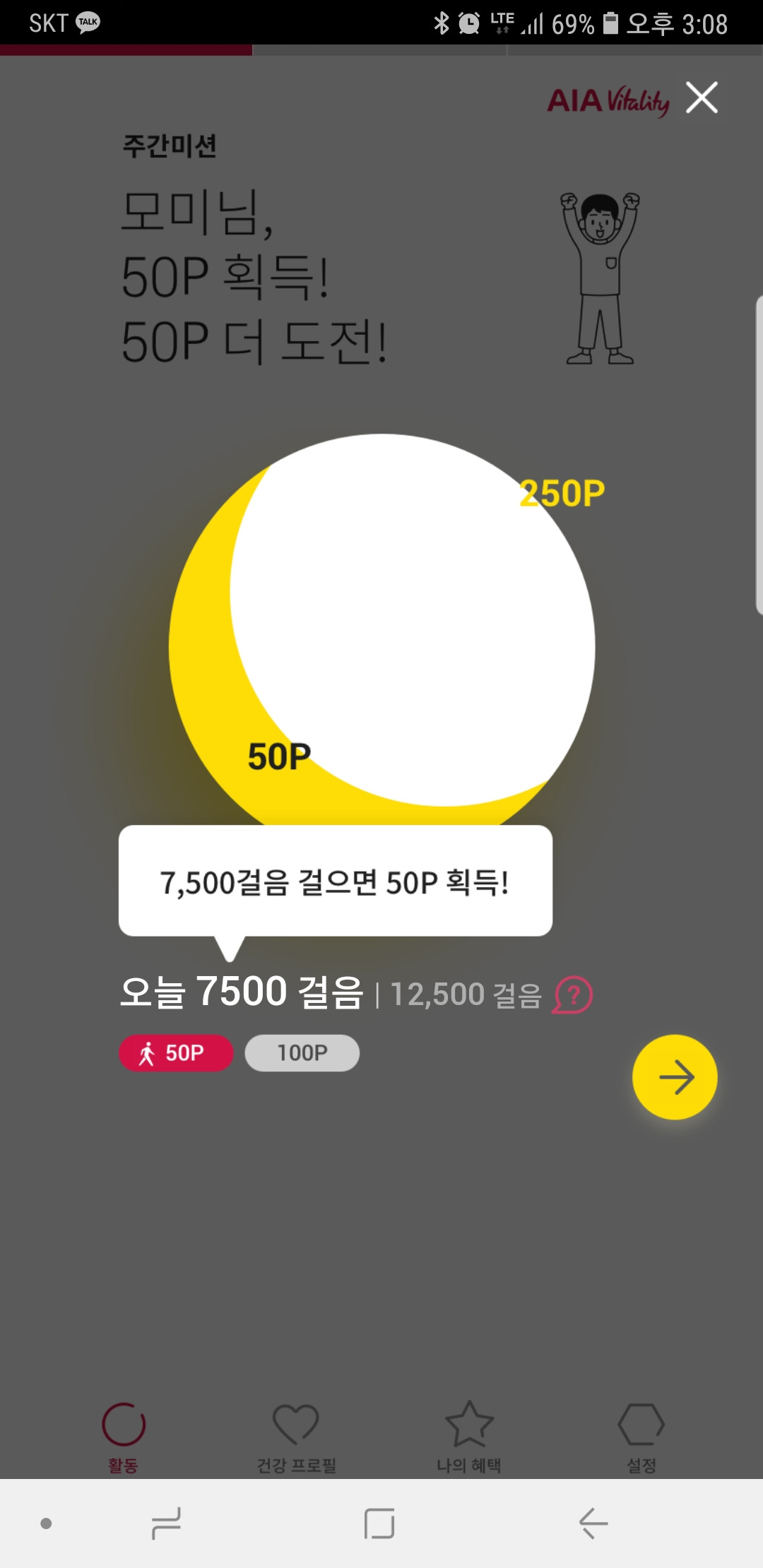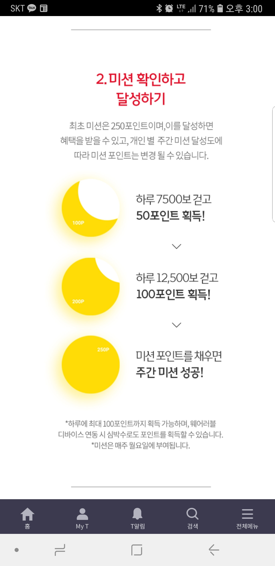 앱에서 제안하는 주간ㅊ걷기 미셤을 달성하면 통신비 할인 및 다양한 혜택 제공이 된다.
