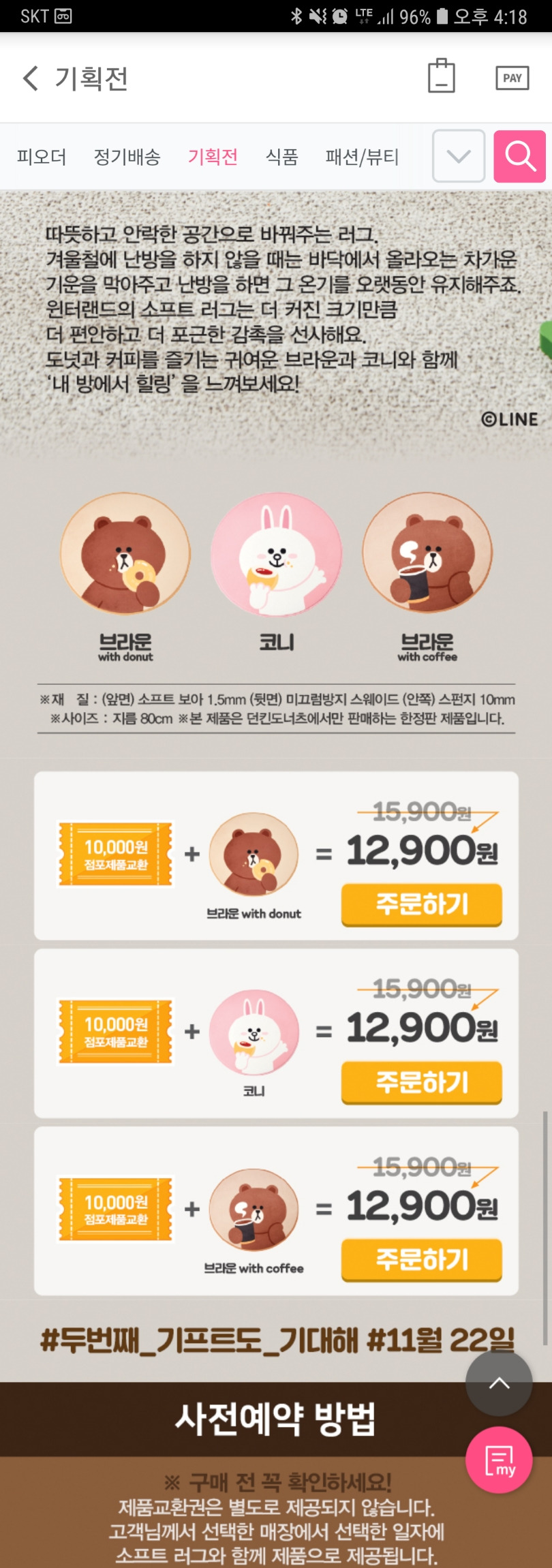 해피오더에서 라인프렌즈 러그가 사전예약 2,900원이다.