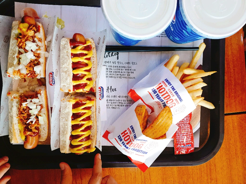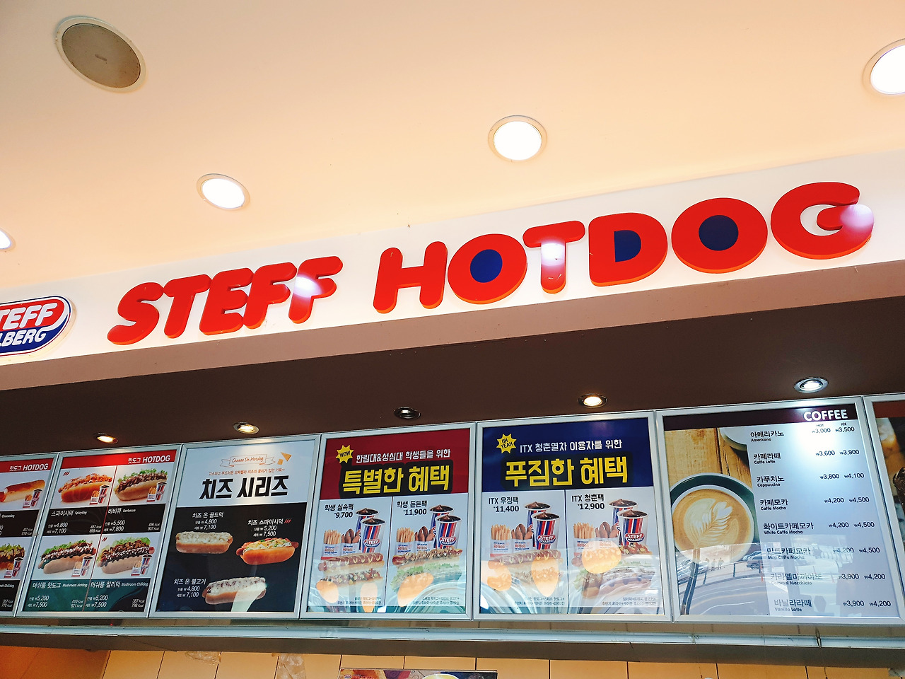 첫째 딸내미가 햄버거가 먹고 싶다고 했다. 그런대 다행히도 춘천역에 핫도그집이 있었다. ITX기차타기 전에 온가족이 간식겸 점심겸 STEFF HOTDOG를 찾는다.