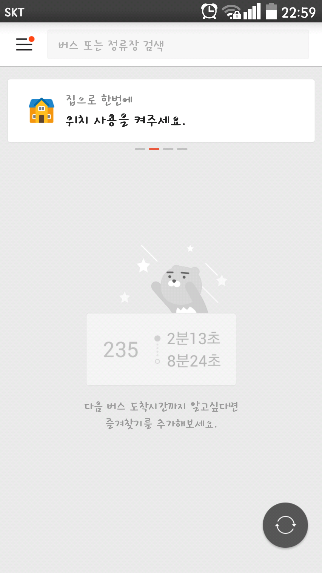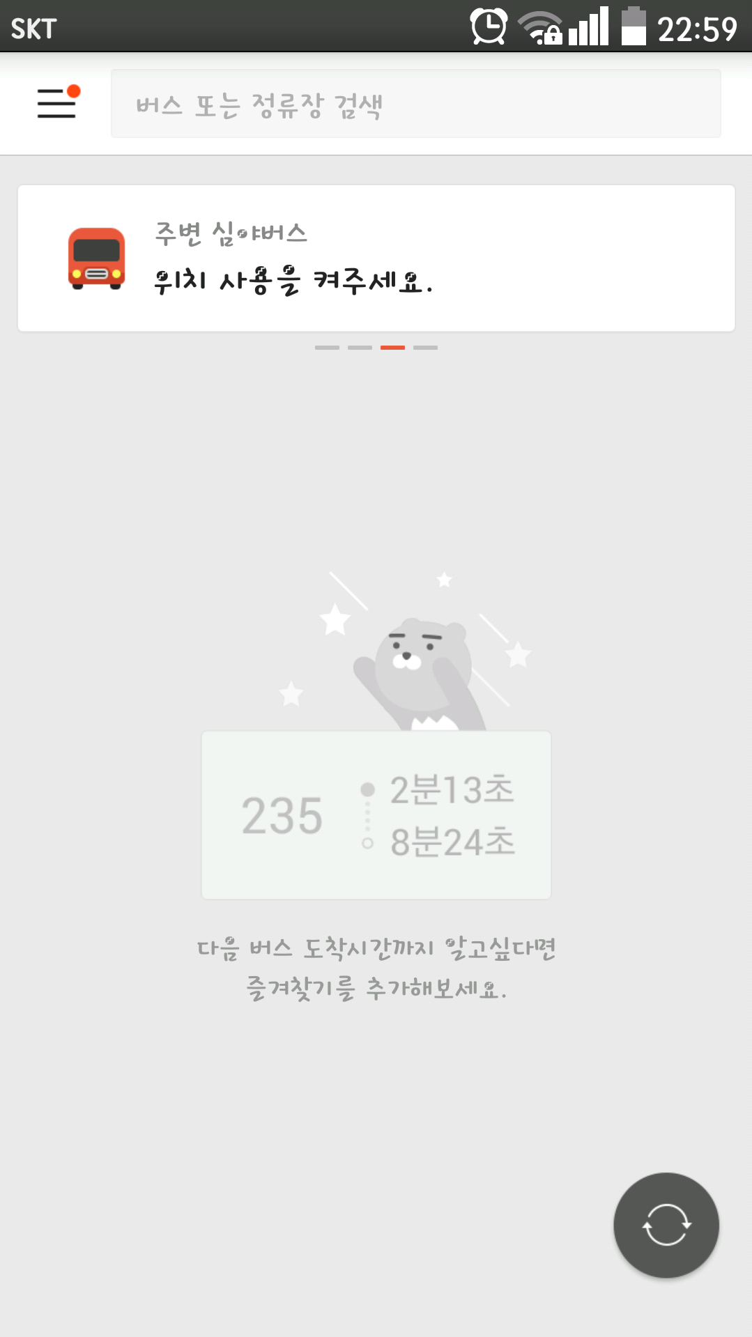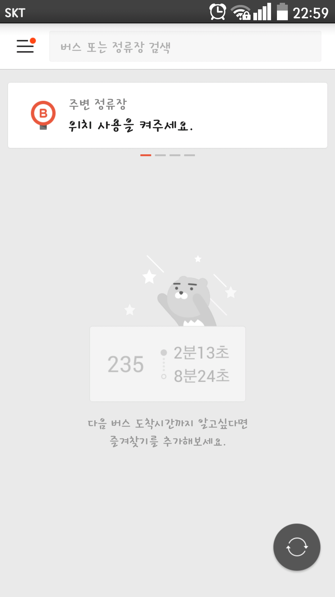 일단 구성을 본다. 우선 한글버전이다. 설치가 되면 계정연결이고, 기본 화면은 주변 정류장 표시가 되고 즐겨찾기 정류장이나 버스를 등록 할 수 있다. 기본 서울버스에 비해 화면 구성이 큼직큼직해 져 직괸성은 높아보인다.