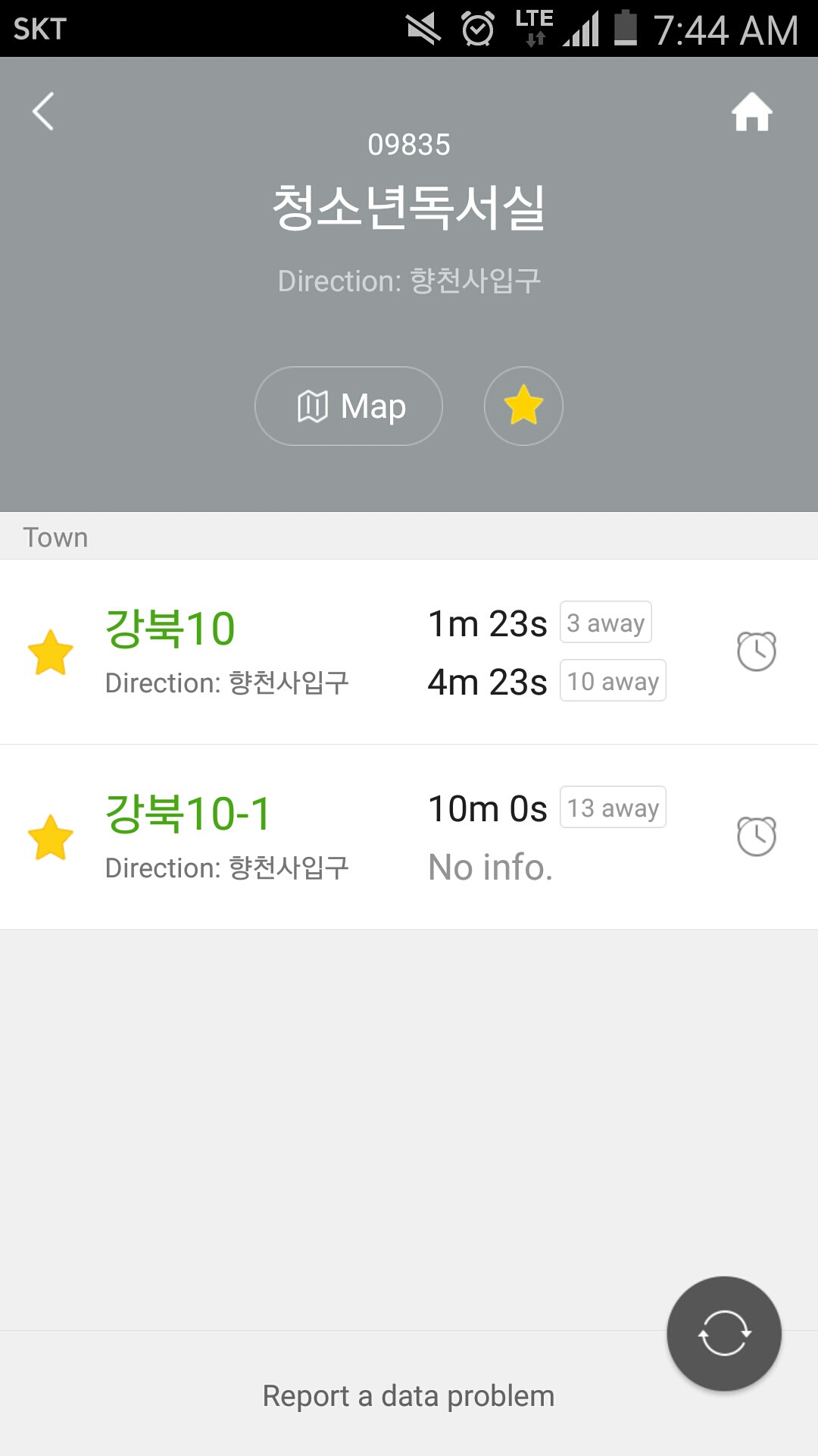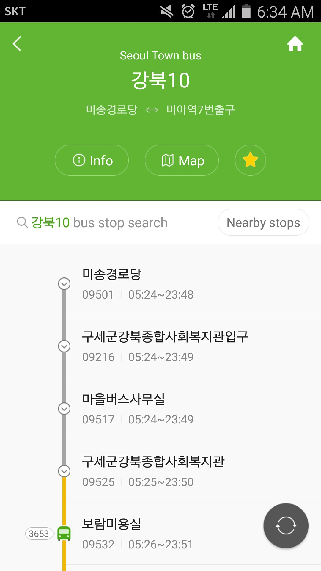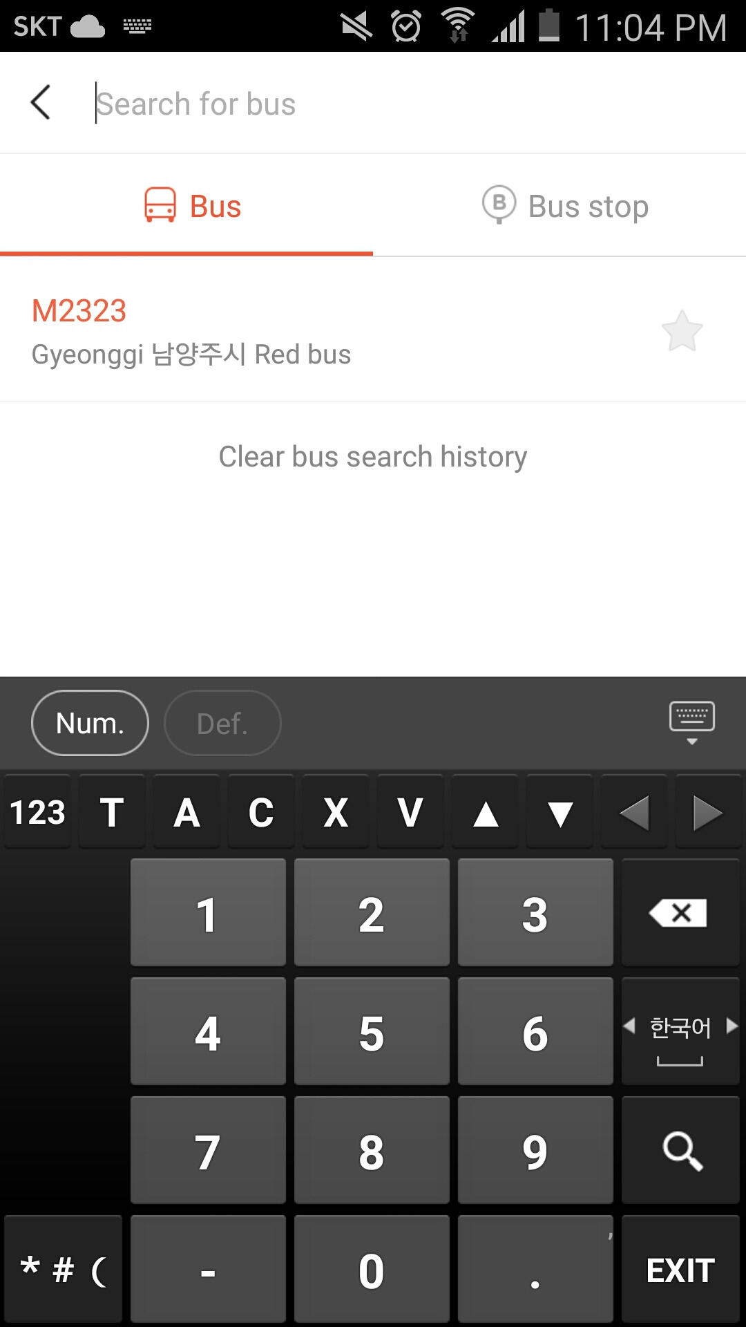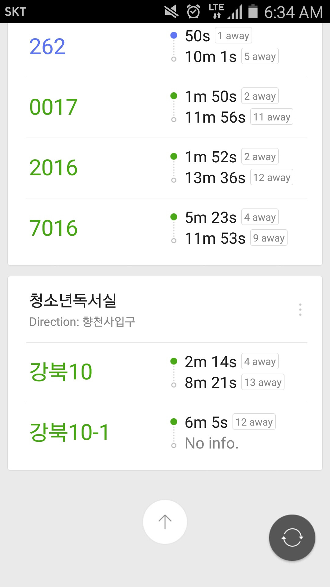 일단 구성을 본다. 우선 한글버전이다. 설치가 되면 계정연결이고, 기본 화면은 주변 정류장 표시가 되고 즐겨찾기 정류장이나 버스를 등록 할 수 있다. 기본 서울버스에 비해 화면 구성이 큼직큼직해 져 직괸성은 높아보인다.