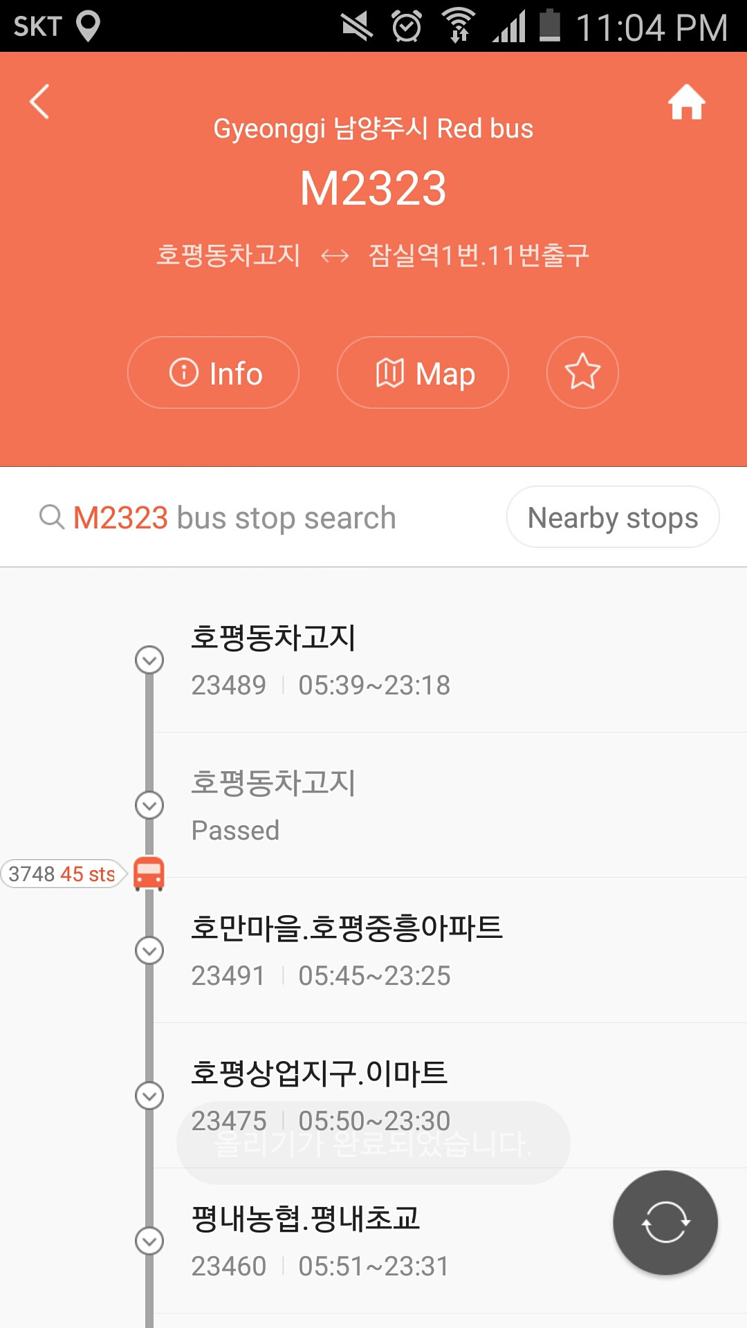 검색은 기존과 유사하게 버스와 버스정류장이 있다. 남양주시 버스를 선택한 이유가 일부 지자체에서는 버스내 잔여좌석 정보를 제공하는 서비스가 있는데 커카오버스에서도 연계되어 았는지 확인하기 위함리였다. 아마도 경기도에서 서울행 좌석버스에 대하여 안전을 위한 입석금지로 인하여 좌석확인을 하는 거라 정보가 연계되는 것안가라는 추측을 해 본다. 좌석정보가 나온다는 것은 나쁘지 않아보인다.