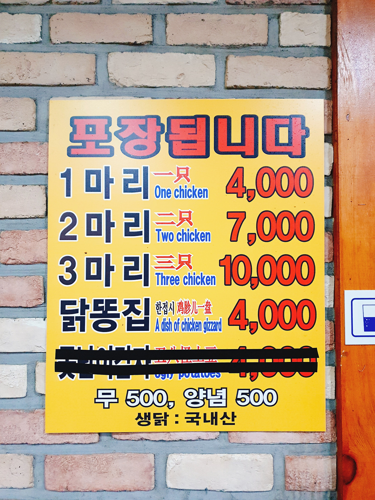 가성비가 끝장난다고 하는 통닭집이다. 만원에 3마리 대신 소스나 무우 돈을 받는다.