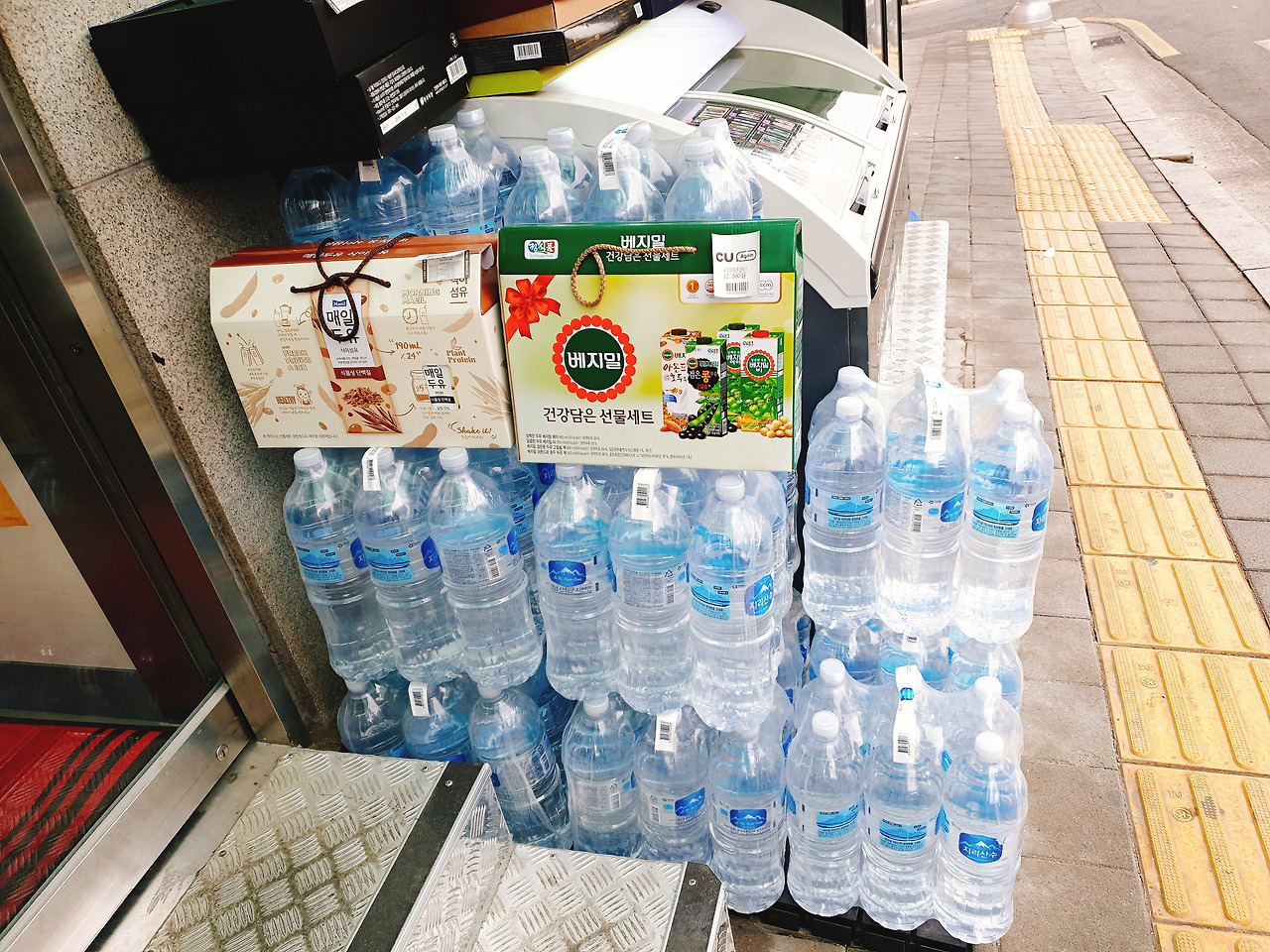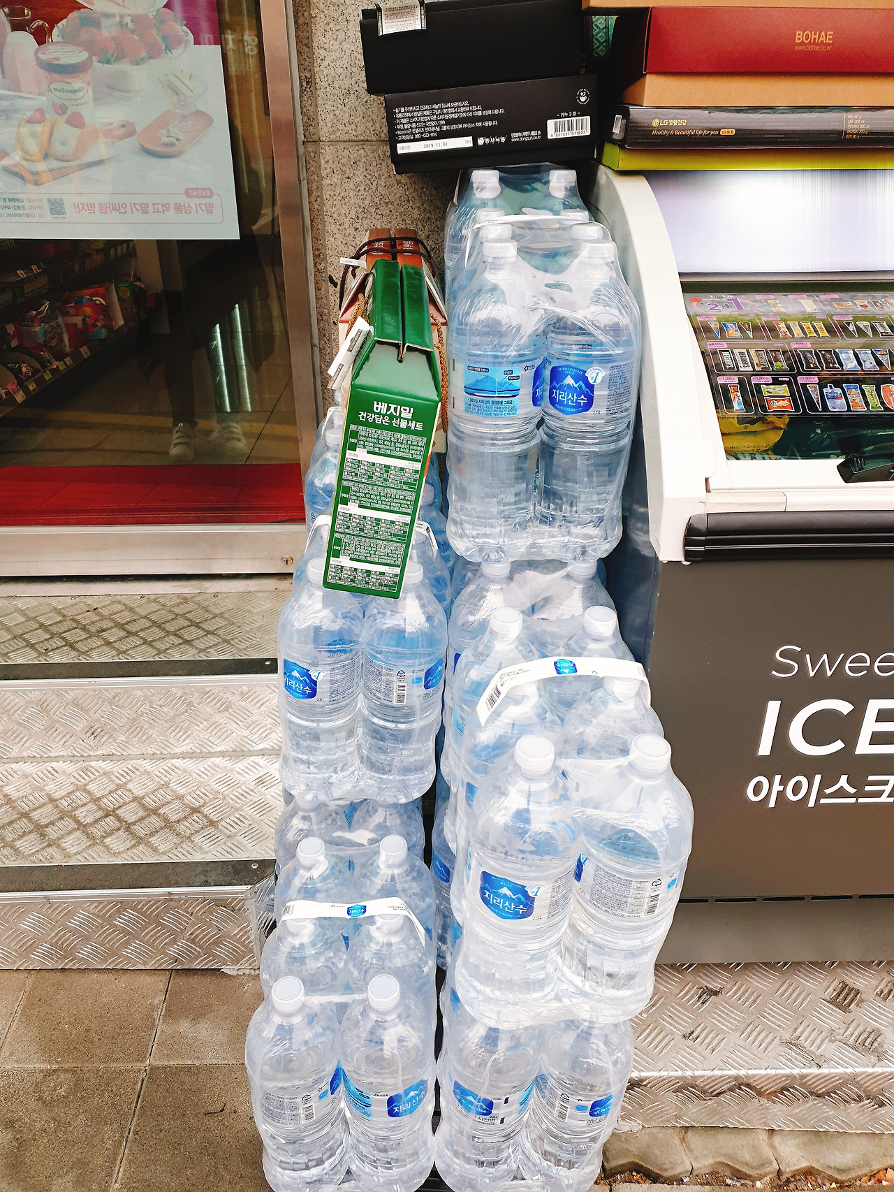 그나마 편의점이 가깝지만, 그래도 물이 떨어지면 누군가가 사와야 하지만 물 사오는 것도 그렇고 재활용 정리도 손이 참으로 많이 갔다고 집사람에게 아야기했다네요.
