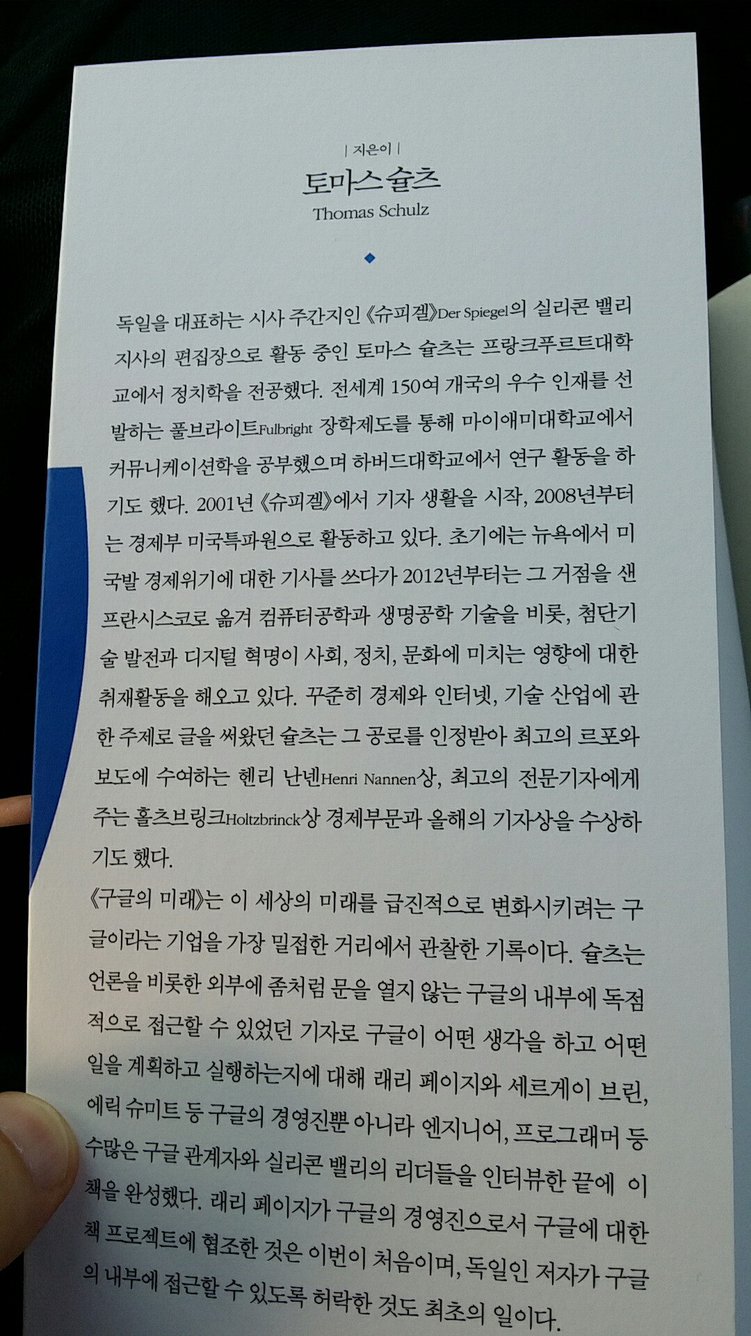 초판이 16년 5월30일로 따끈 따끈한 신간이며, 최근의 구글, 다시 말해 작년까지 언급이 되어 있다. 저자는 독일 시사주간지의 편집장이다. 그는 구글의 경영진뿐만 아니라 앤지니어, 프로그래머 등 수많은 구글 관계자와 실리콘밸리의 리더들의 인터뷰 후에 이 책을 완성했고, 구글 경영진인 래리 페이지가 협조를 받았다고 책 옆날개의 지은이 설명에 언급되어 있다.