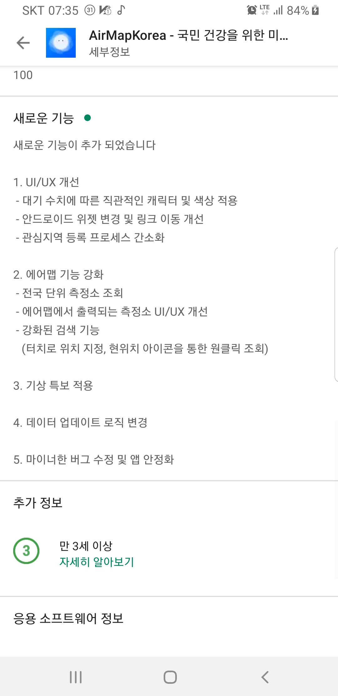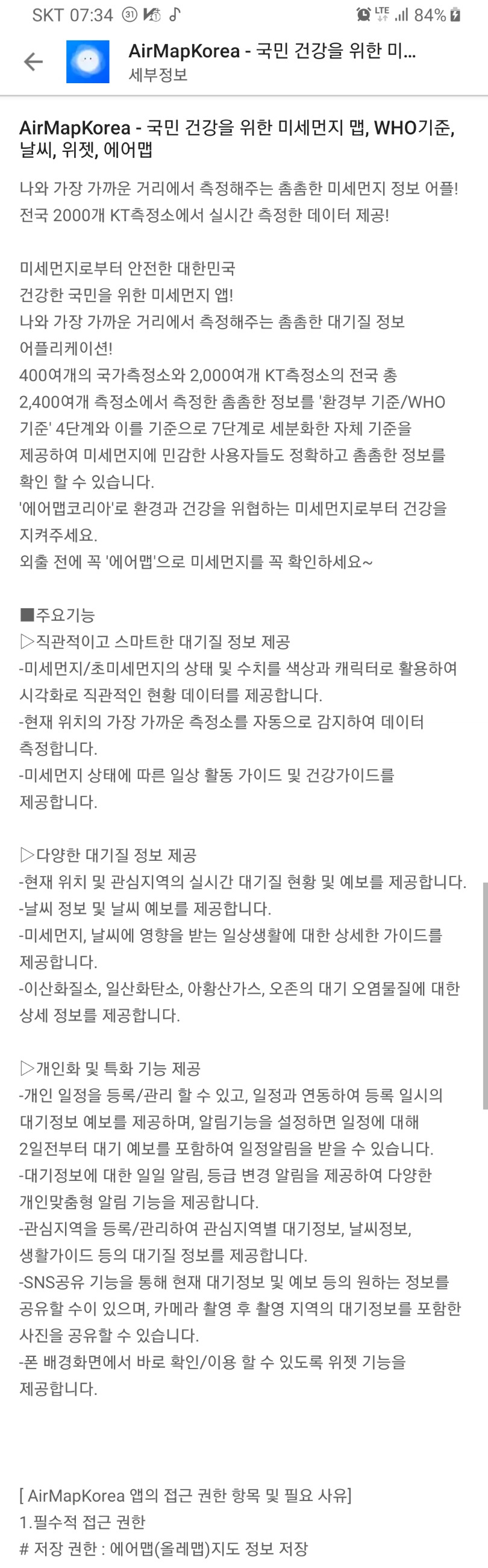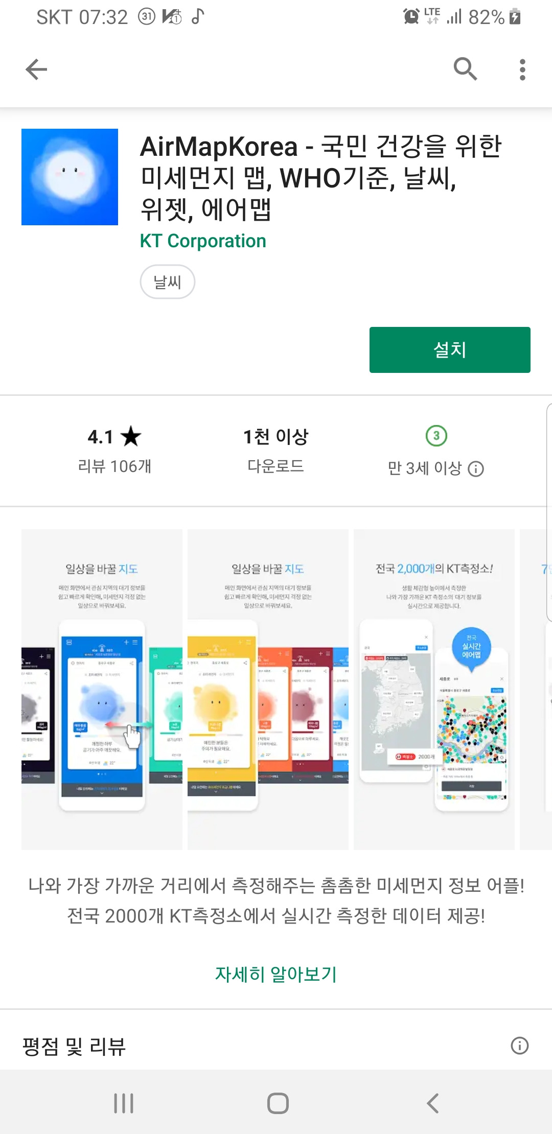 미세먼지 kt로 검색, 출시된 지 별로 되지 않아서 아직은 몇 다운로드 안 한 듯하다.