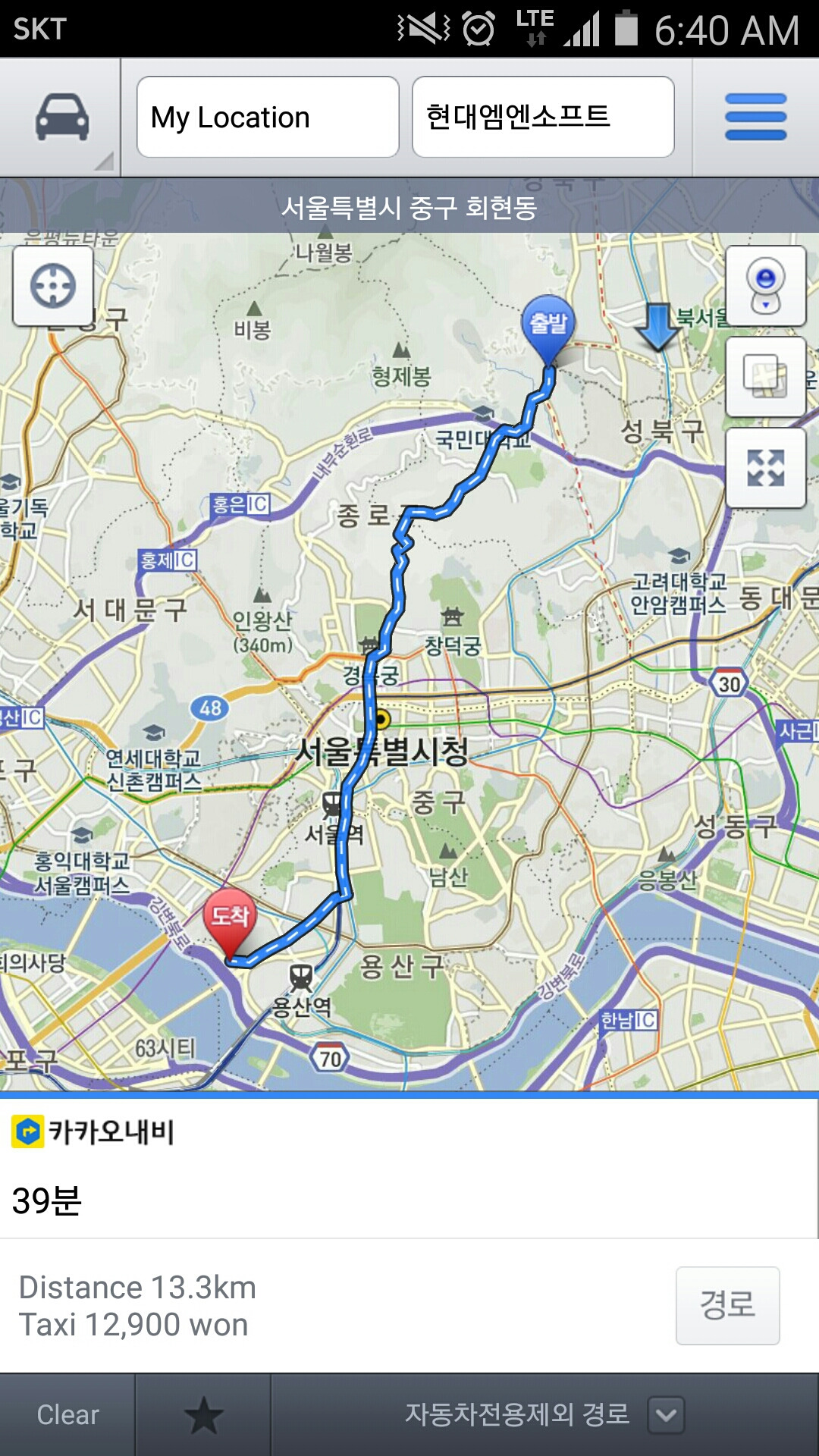 비가 와서 차가 막힌다. 초반부터 차가 가득하다. 길안내를 해본다. 여전히 내가 선호하는 길인 "삼청터널길"은 안 나온다. 여러가지 옵션을 체크해야 나온다. 혹시나 내가 가는 길이 막혀서 추천하지 않는 것일까?