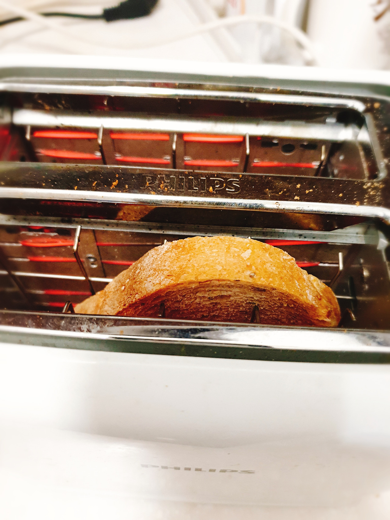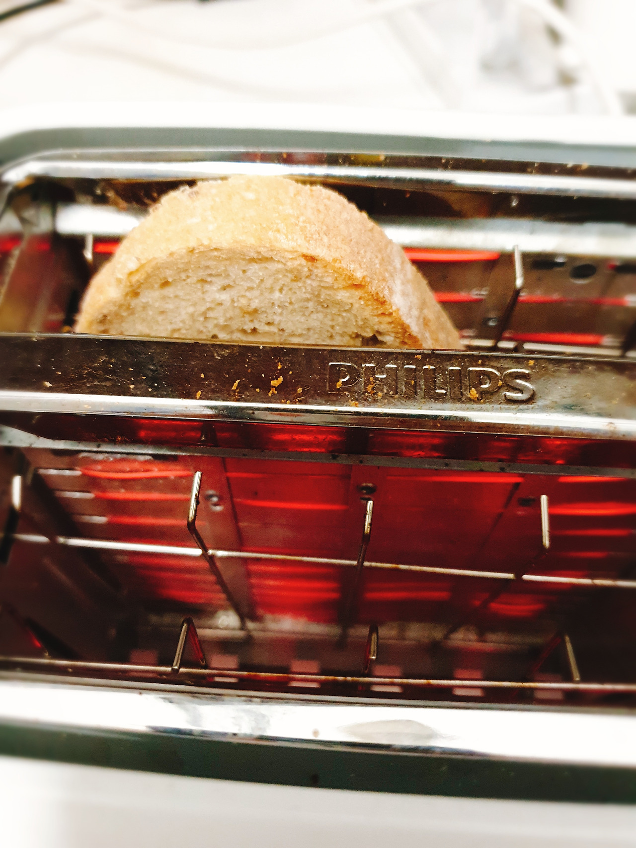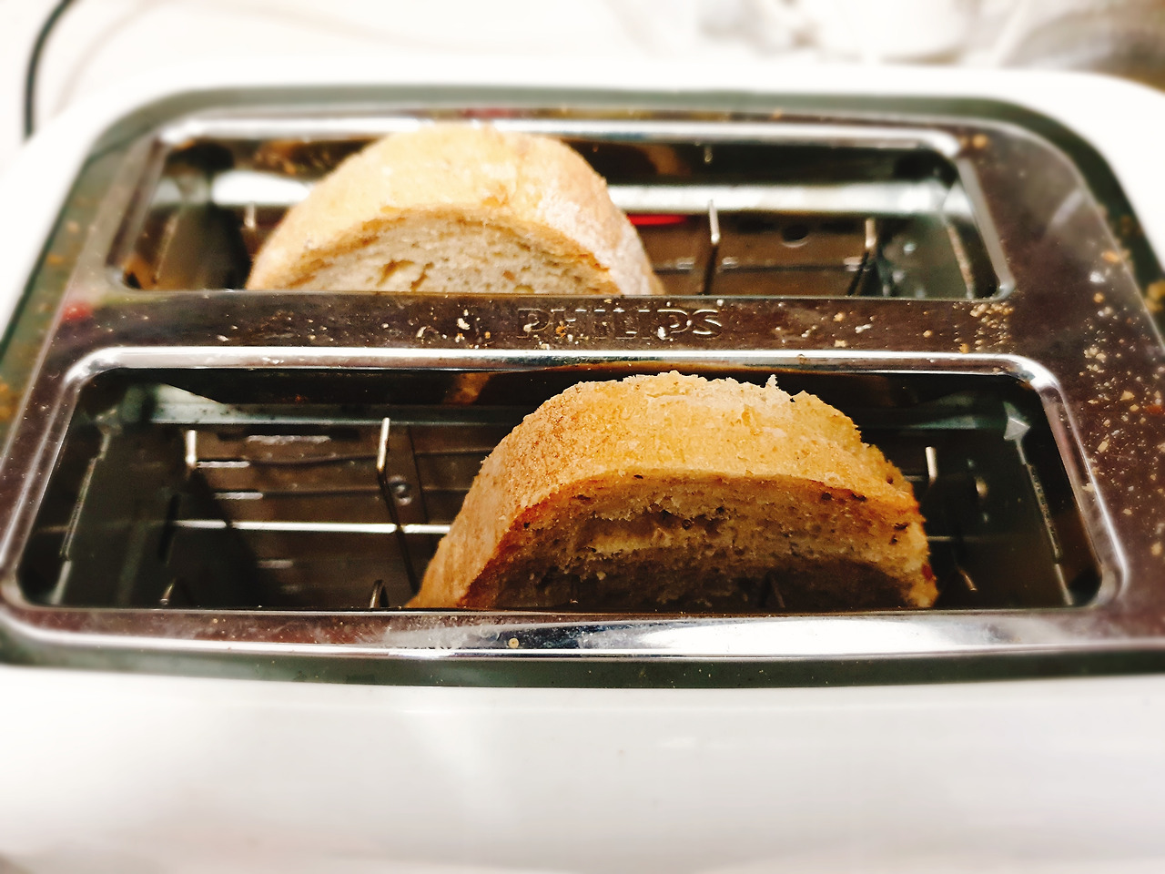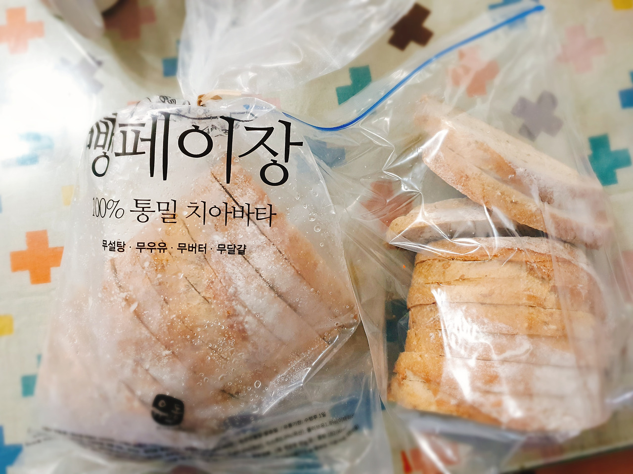 냉장보관된 빵을 토스트기로 해동시킨다.
