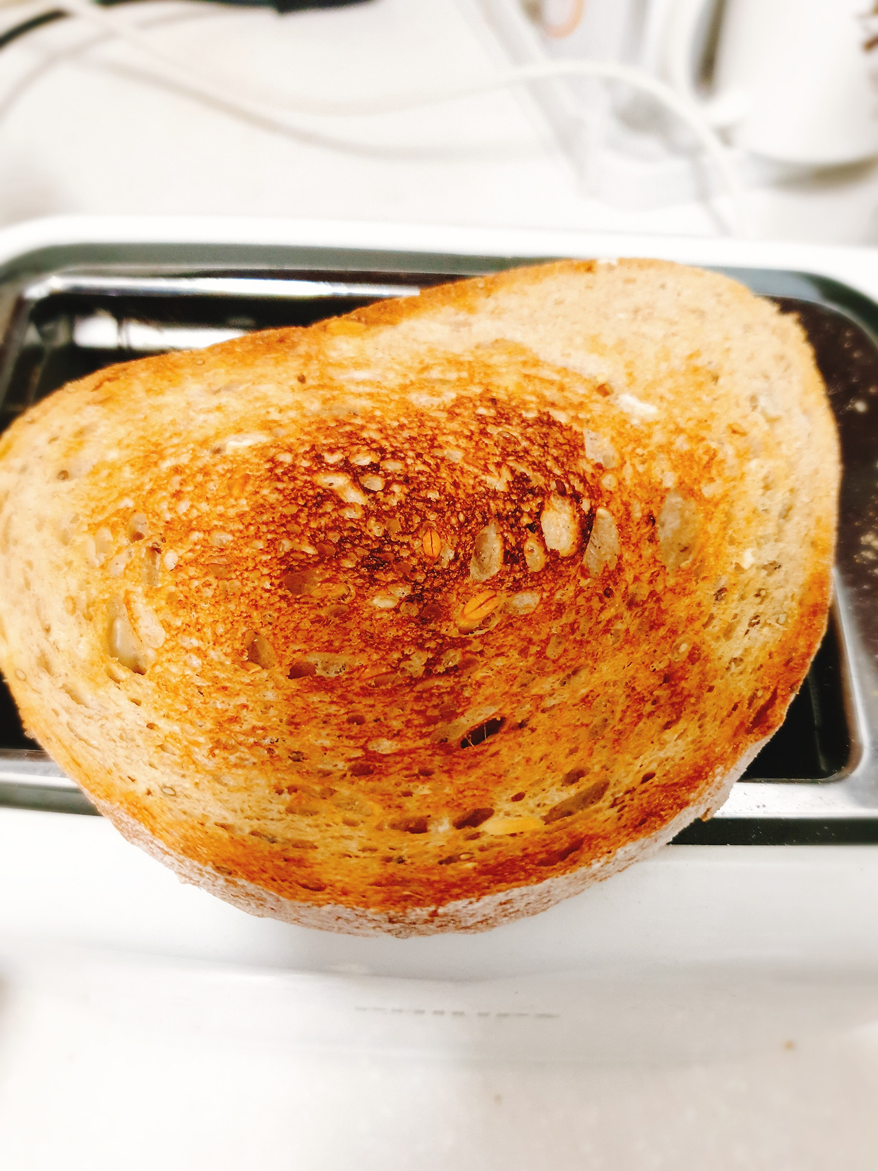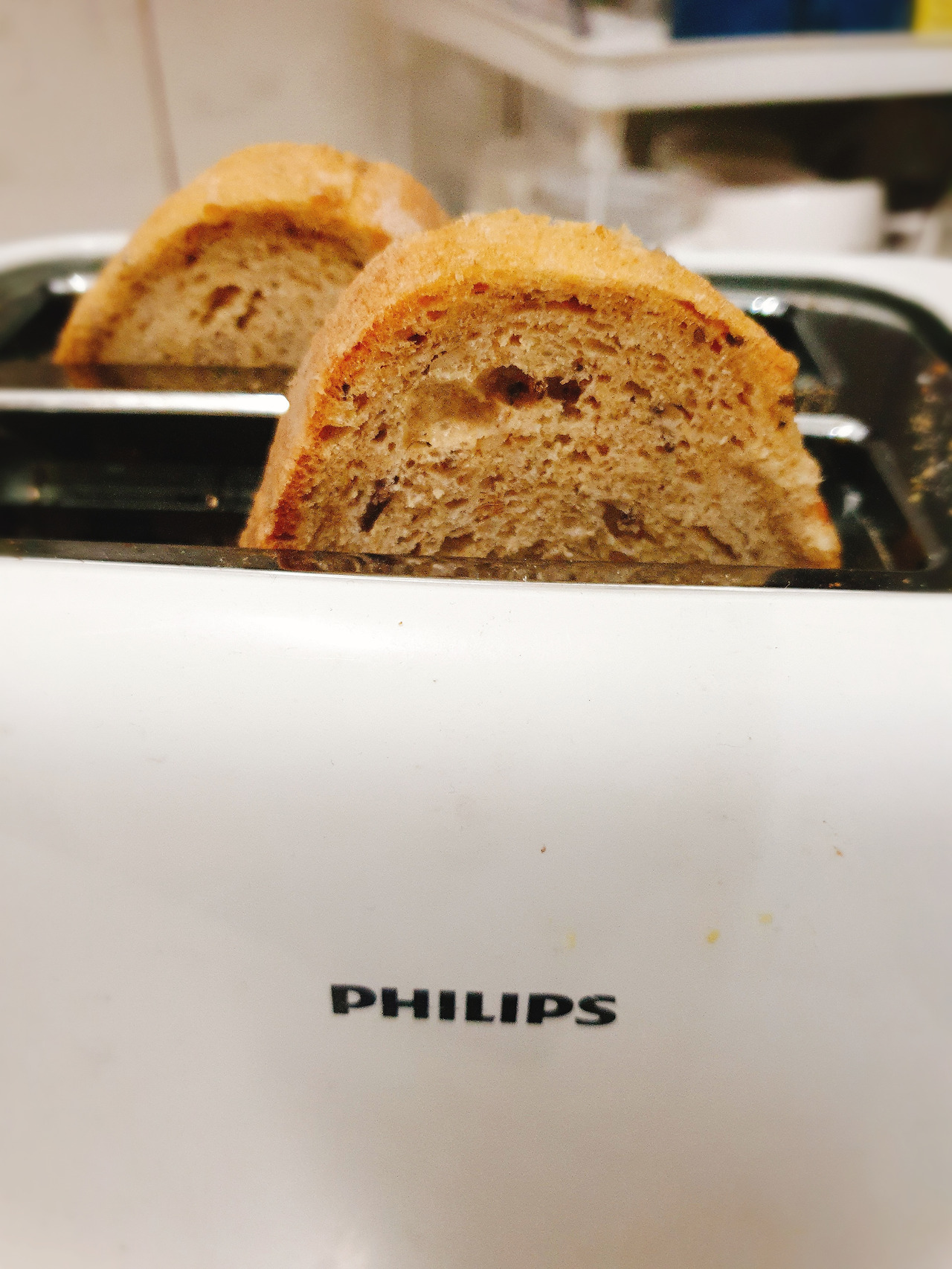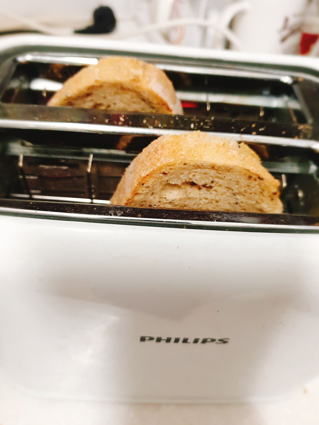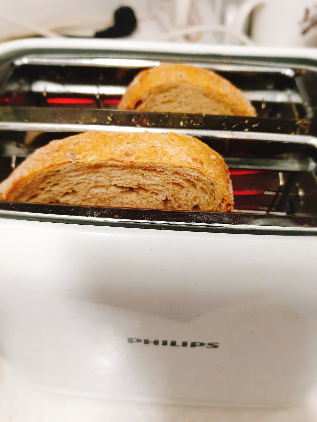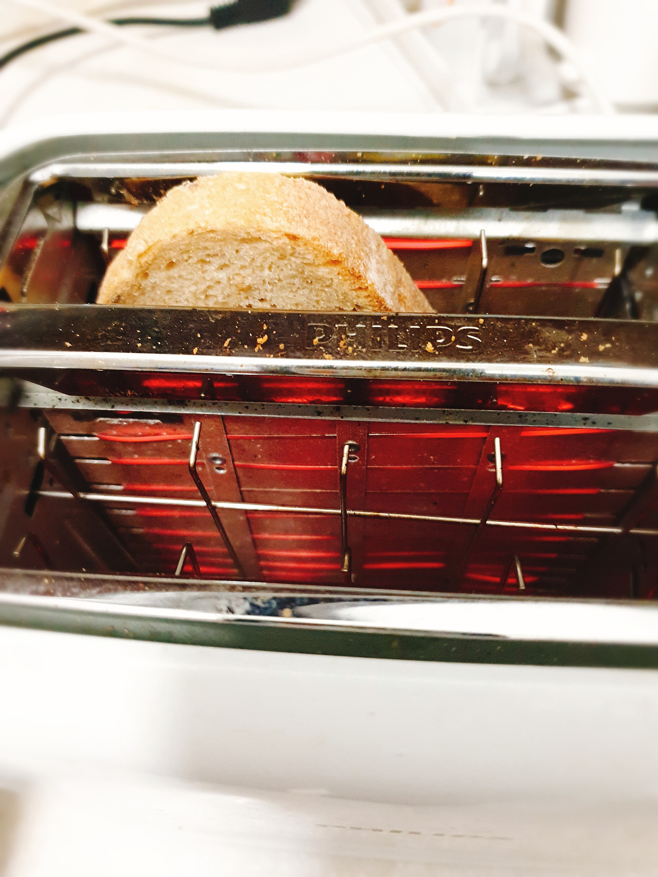 냉장보관된 빵을 토스트기로 해동시킨다.