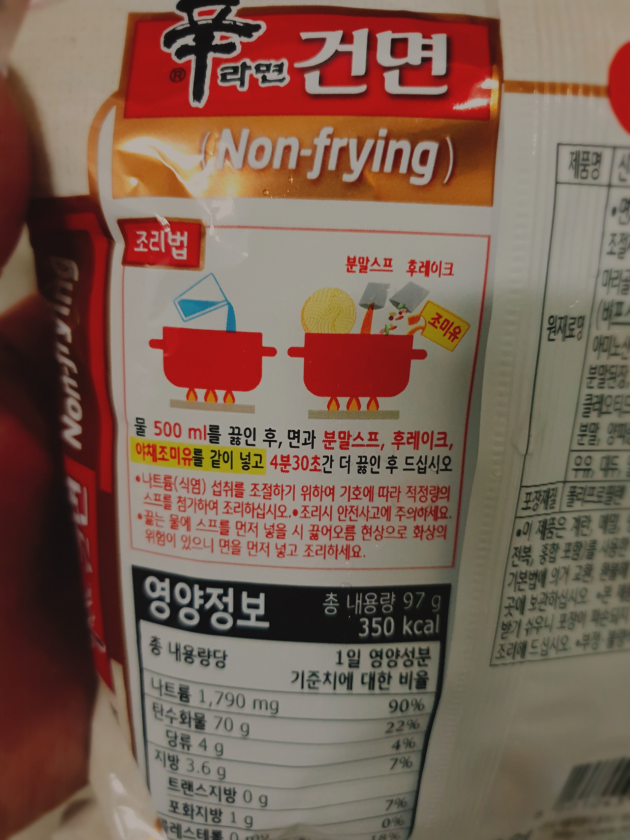 ① 물 500ml 넣는다.② 끓인다.③ 건면과 스프3개를 넣는다.④ 4분 30초간 더 끓인다.