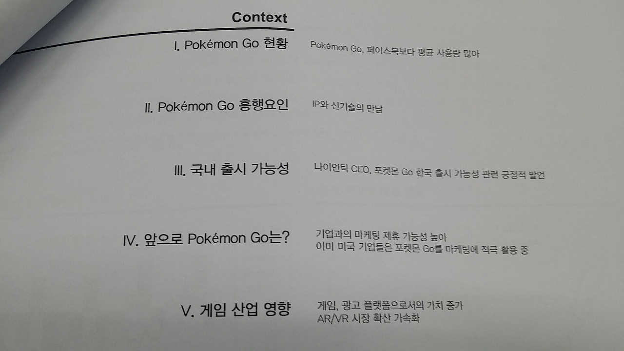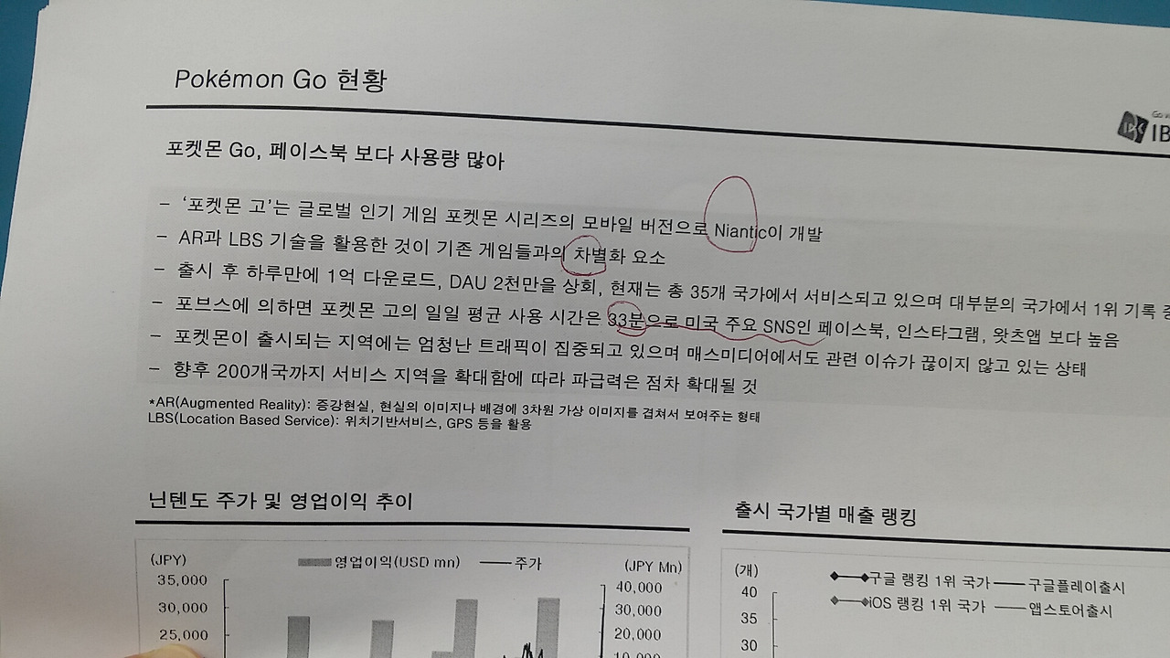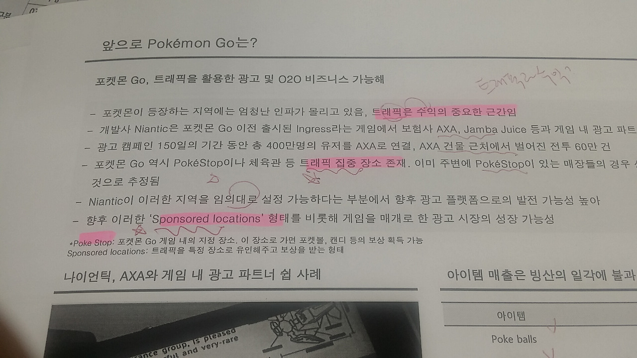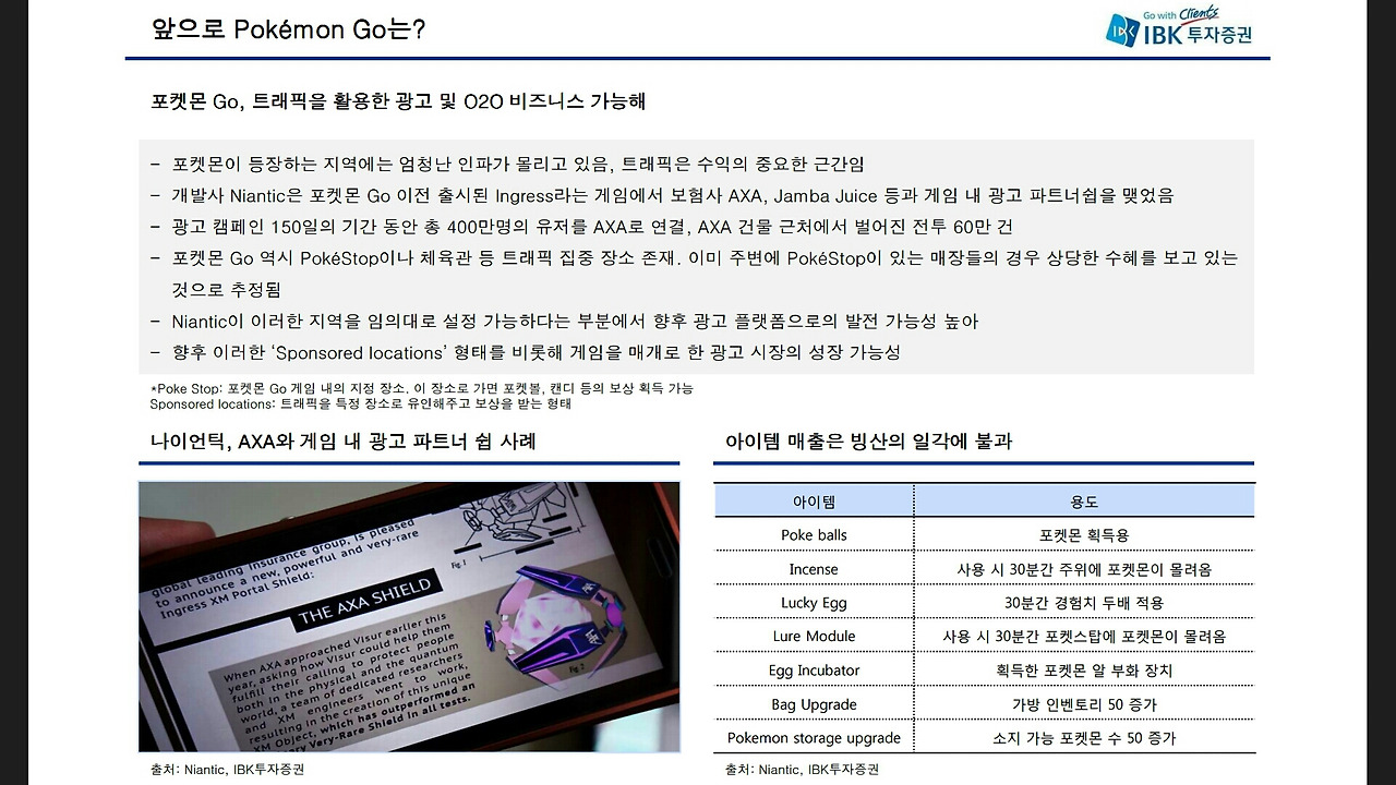 이미 충분히 이슈가 되었고 국가별 출시로 한 동안 유명세를 더 탈 것이다. AR기술이 접목되어 여느 아이템보다 복합적인 영향도를 가지고 있어, 이슈는 이슈로 확대 될 것이다. 물론 섣부른 항국형서비스의 접목으로 분명 논점이 흐려질 수도 있을 것이다.