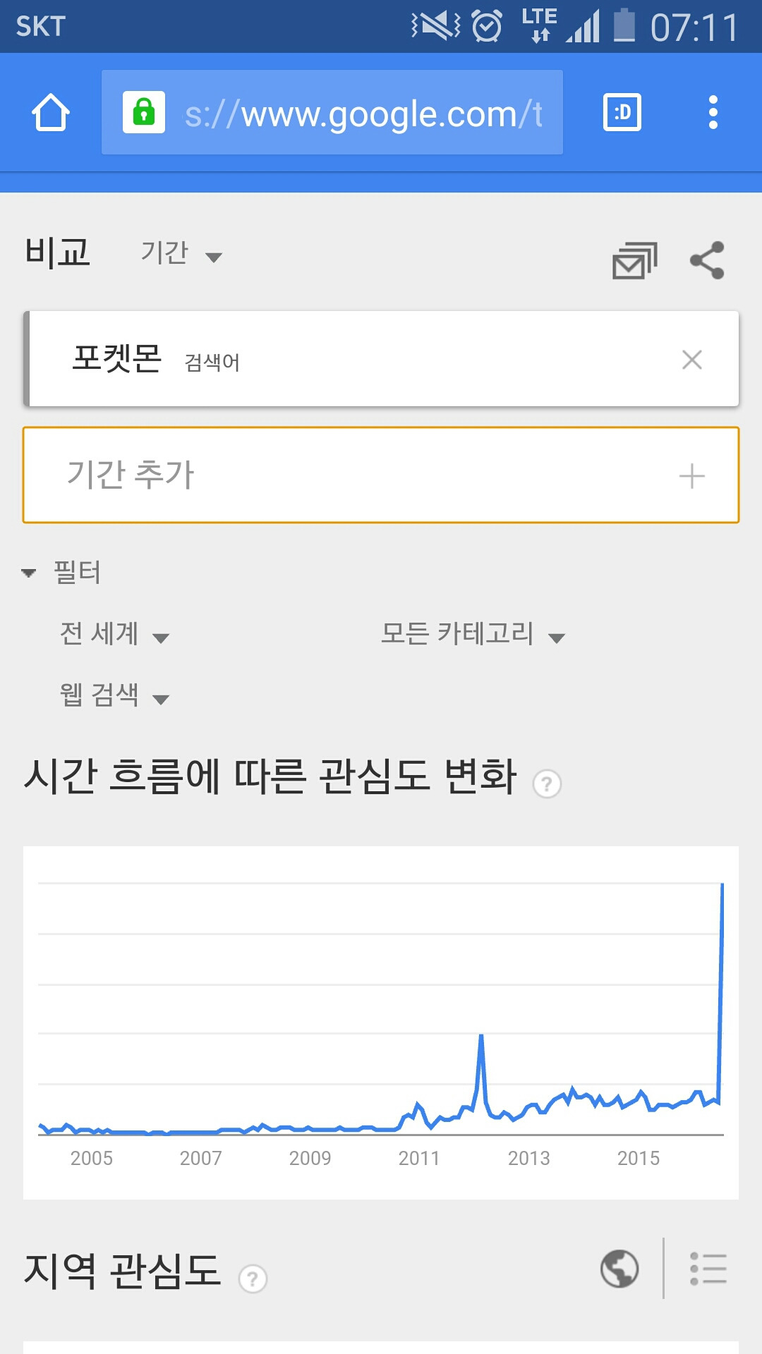 구글트렌드에서 "포켓몬"으로만 검색해 본다. 역시 어느정도는 IP로의 위치는 확보하고 있었다.