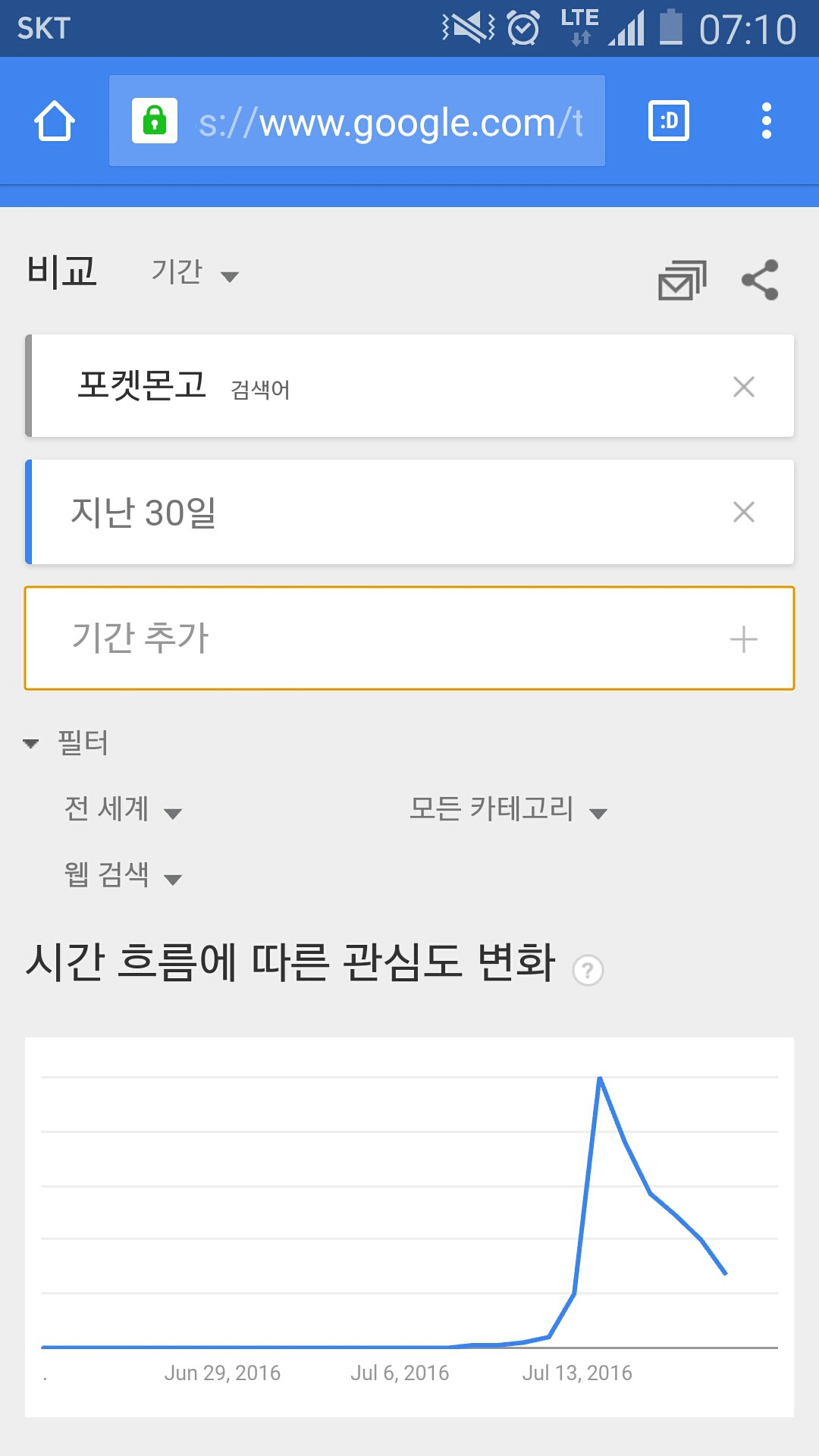 컨텐츠라고 시작되었지만 세계관이라는 표현도 서슴없이 하고 있다. 데이터네이버랩스와 구글트랜드에서의 한달간 포켓몬 고의 빈도를 볼 수 있다.