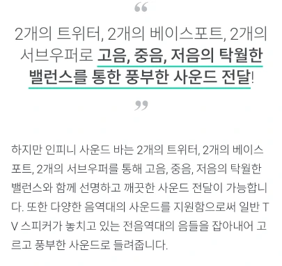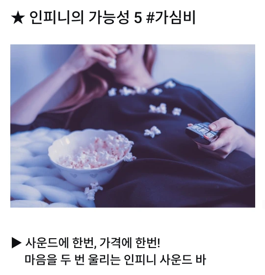 나만의 영화관, 나만의 공연장, 혹은 취미생활을 즐길 수 있는 나만의 공간을 꿈꾸고 계신가요? 당신의 공간을 채우고 있는 소리, 그리고 그 소리를 바꾸어 줄 사운드 바 인피니입니다