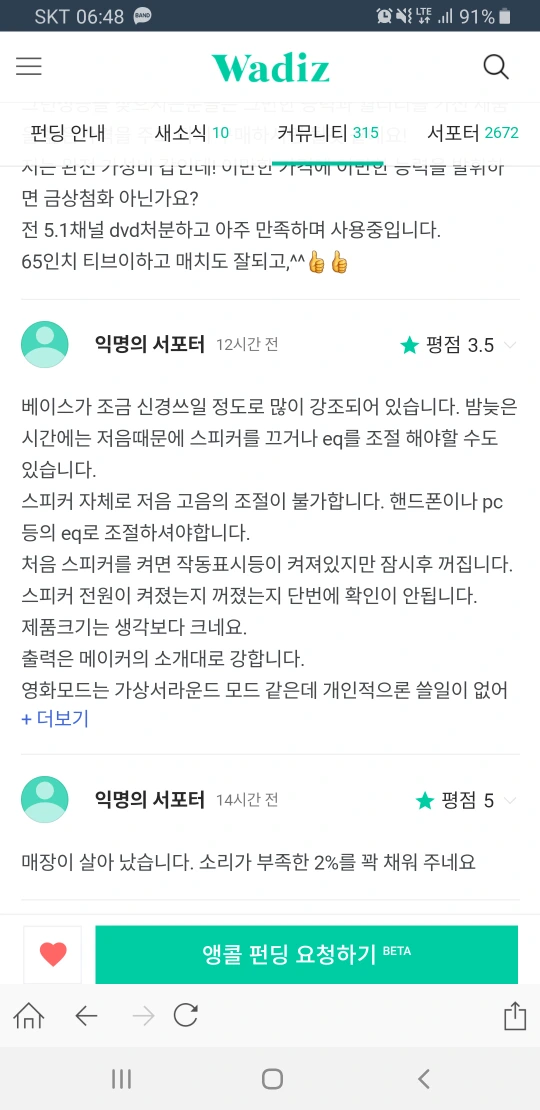 와디즈 평을 다시 보았지만 일부 극약평도 있지만 그래도 만족이다. 그런데 인피니, 앤커 로고가 없다. 내가 못 찾아서 그런가?나름 만족이다. 온종일 유튜브, 맬론 주구장창 음악을 노트북 블루투스로 돌리고 있다.