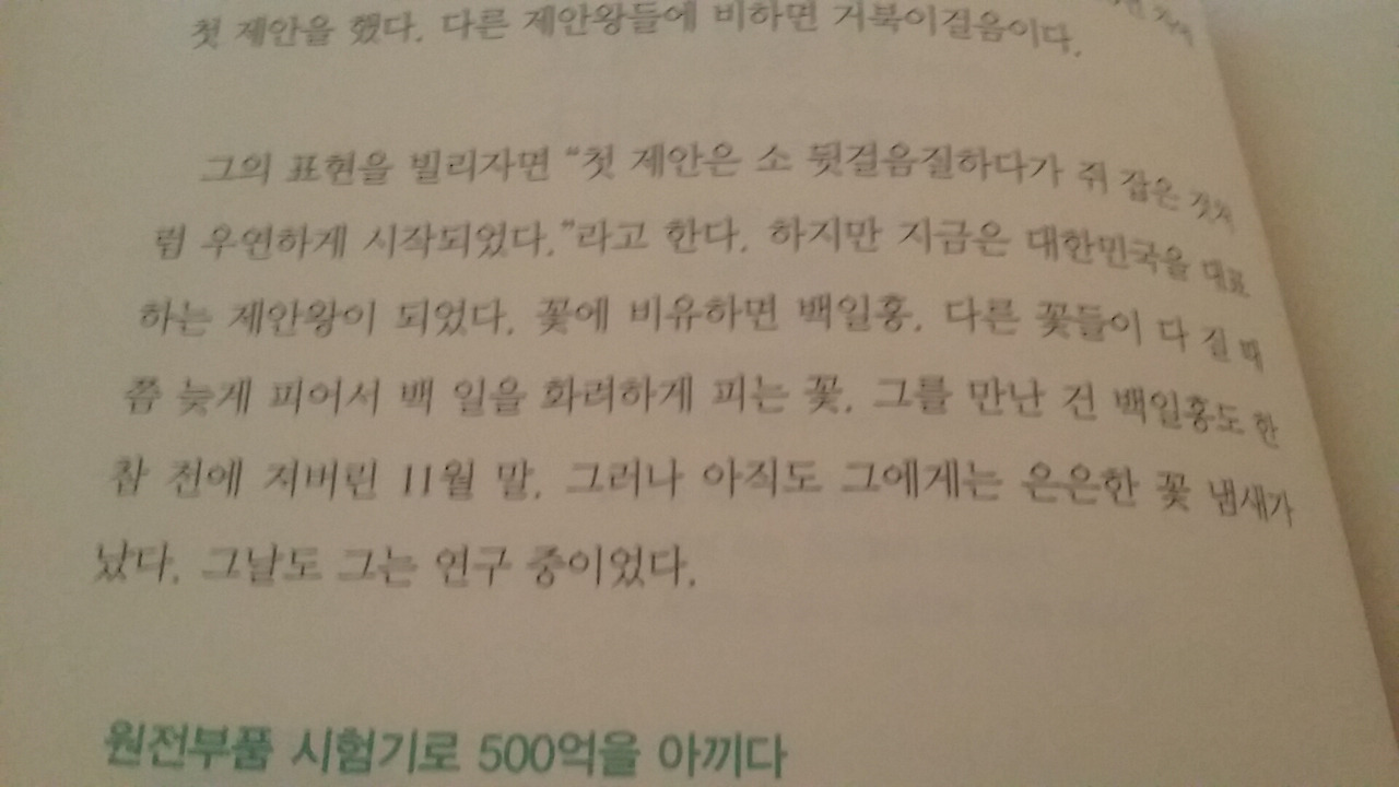 네이버 전문정보에서 내 이름으로 검색하면 특허가 몇 개 나온다. 어떤면에서는 그들스런 모습들이 나에게 있었다. 끊임없이 새로운 서비스와 아이디어에 도전 한 나 역시 회사에서 주는 발명왕(특허8개) 상을 받은 적이 있다. 하지만 아이디어의 고갈을 쉽게 만나게 되었다. 누구나 개선활동에 집착 할 시기가 있다. 하지만 지속적이지 않다.