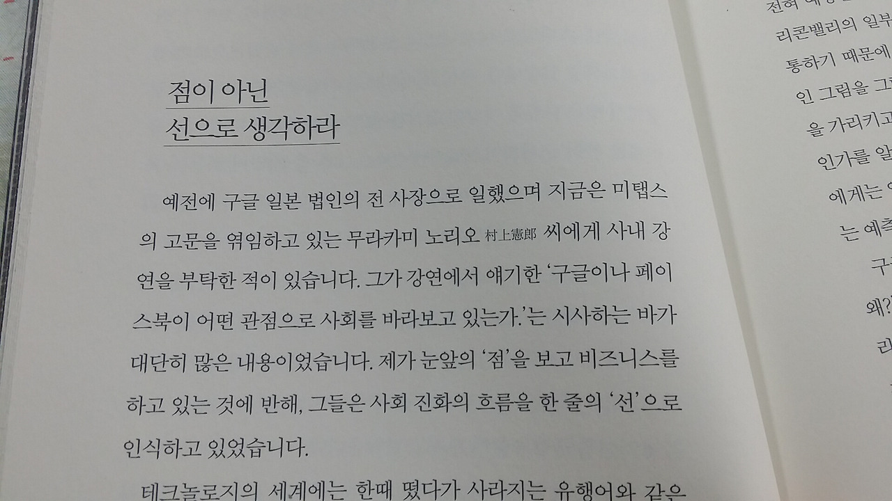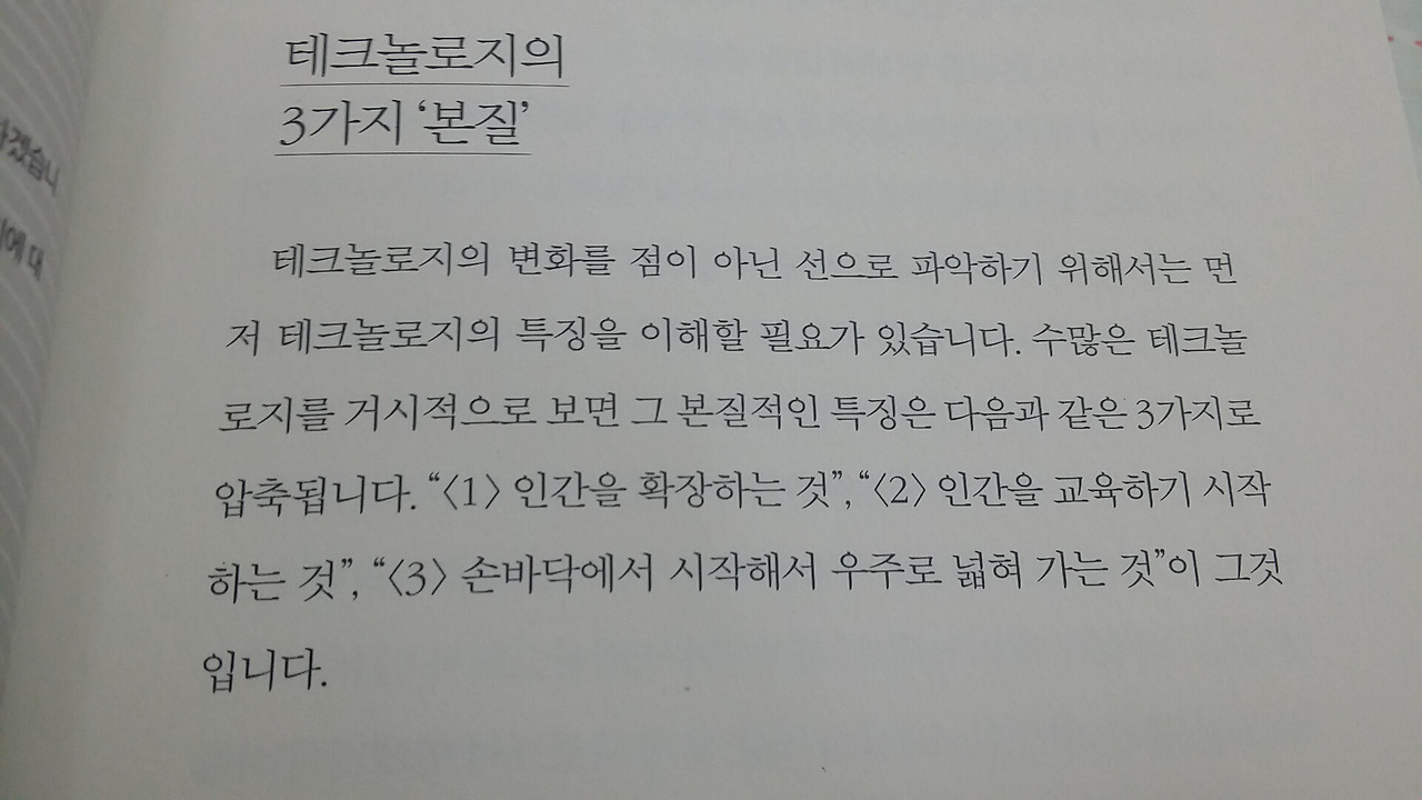 책의 서두에 언급은 인간을 확장/인간을 교육/우주로 넓혀나감 이라는 테크놀로디의 본질적인 특징으로 선언한다. 구라고 그 배경은 점에서 선으로라는 의미가 담겨져 있다.