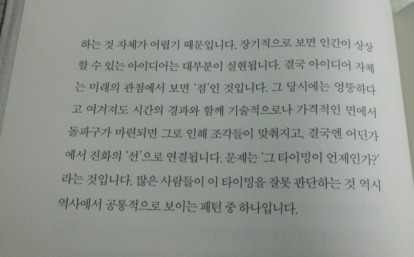미래에 관심이 있었을까? 앞서가는 것에 초점이 맞추어진 것일까? 솔직히 미래라는 것에 더 의미를 두게 되었다. 책에서도 시간과 기술을 너무 앞서간 니콜라 테슬라를 언급하기도 한다. 바로 타이망에 대한 것이다. 갖추어져 있을 때 효과가 빛을 발한다고 할 수 있다.