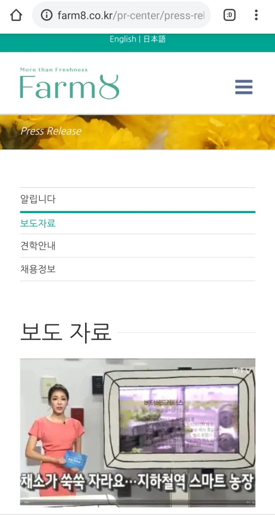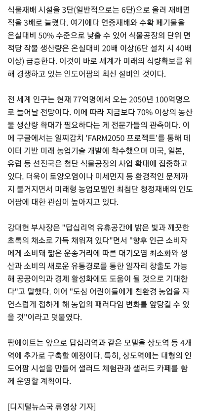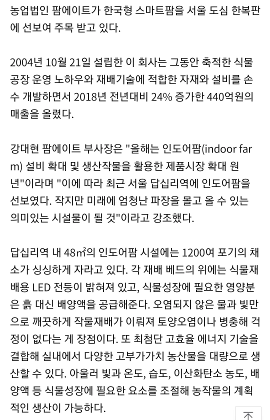 답십리역 내 IT·BT 접목한 스마트팜으로 싱싱한 채소재배 농업법인 팜에이트가 한국형 스마트팜을 서울 도심 한복판에 선보여 주목 받고 있다. 2004년 10월 21일 설립한 이 회사는 그동안 축적한 식물공장 운영 노