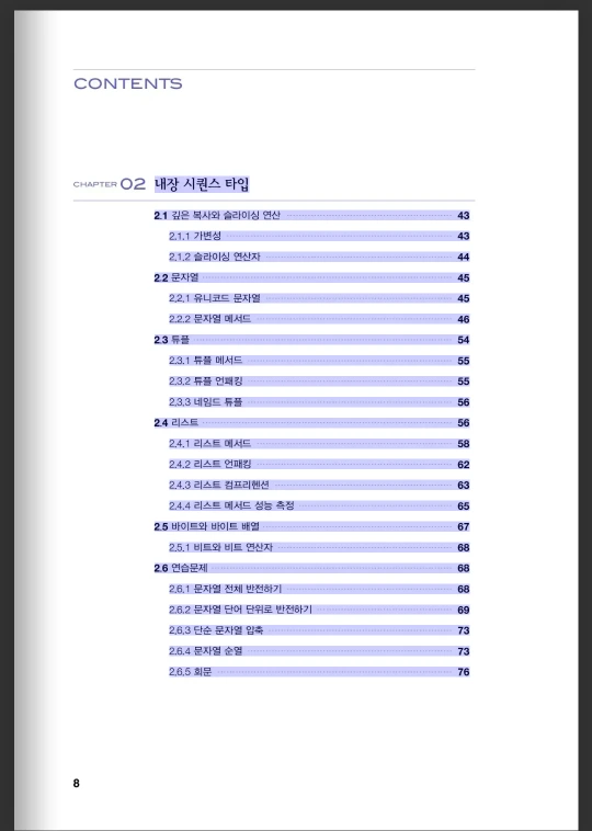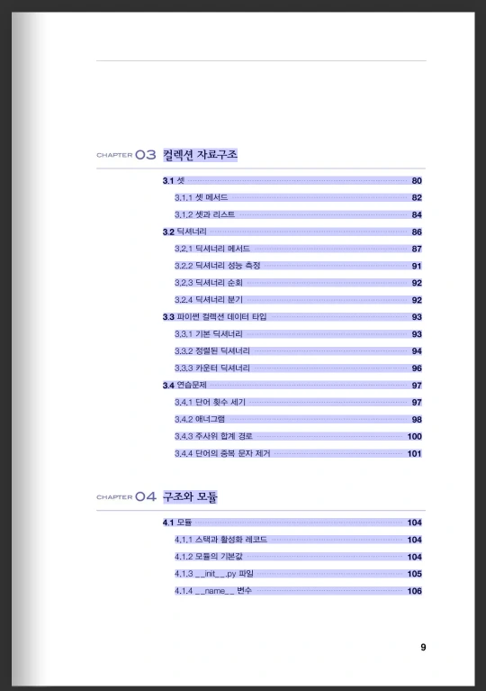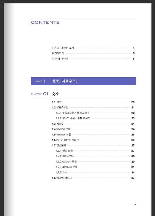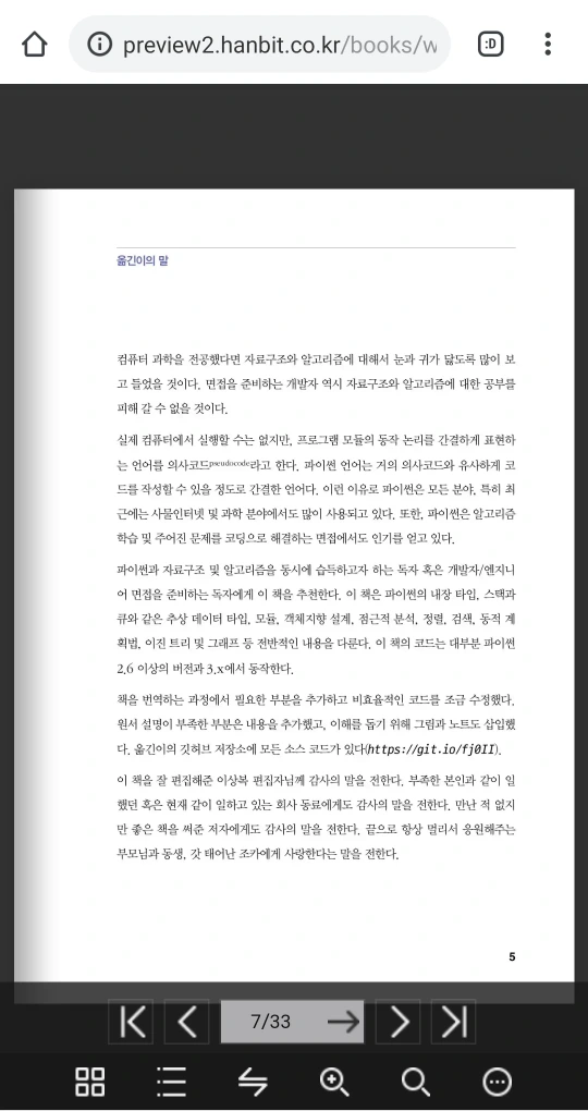 옮긴의 말에 빌리자면파이썬과 자료구조 및 알고리즘을 동시에 습득하고자 하는 독자 혹은 개발자/엔지니어 면접을 준비하는 독자에게 이 책을 추천한다고 한다.그렇다. 요새는 파이썬이 대세이니 필수과목도 패스하고 파이썬도 익힌다는 것이다.일거양득이라는 것이다. 기대가 된다.