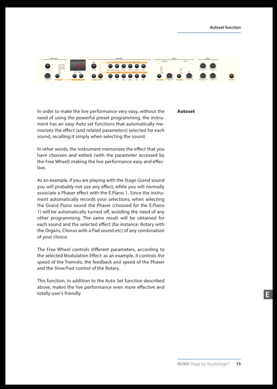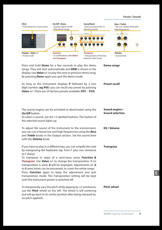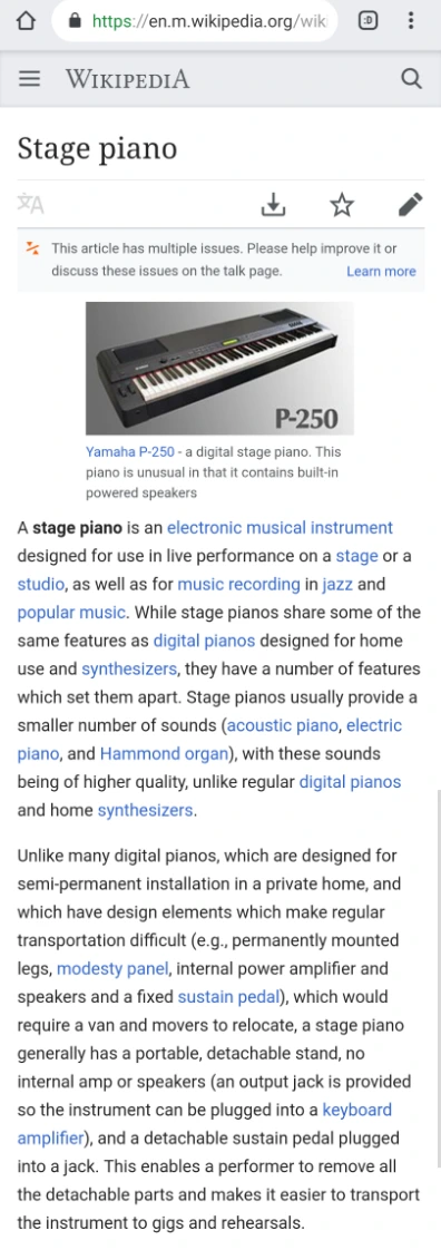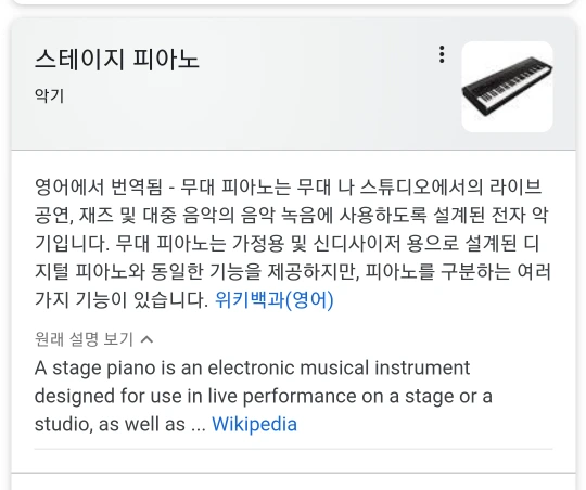 무대 피아노무대나 스튜디오에서의 라이브 공연, 재즈 및 대중음악의 음악 녹음에 사용하도록 설계된 전자 악기무대 피아노는 가정용 및 신디사이저 용으로 설계된 디지털 피아노와 동일한 기능을 제공하지만, 피아노를 구분하는 여러 가지 기능이 있음