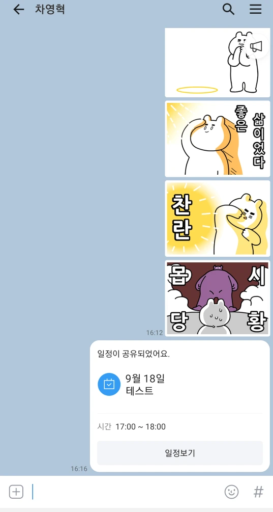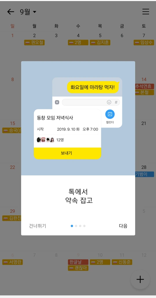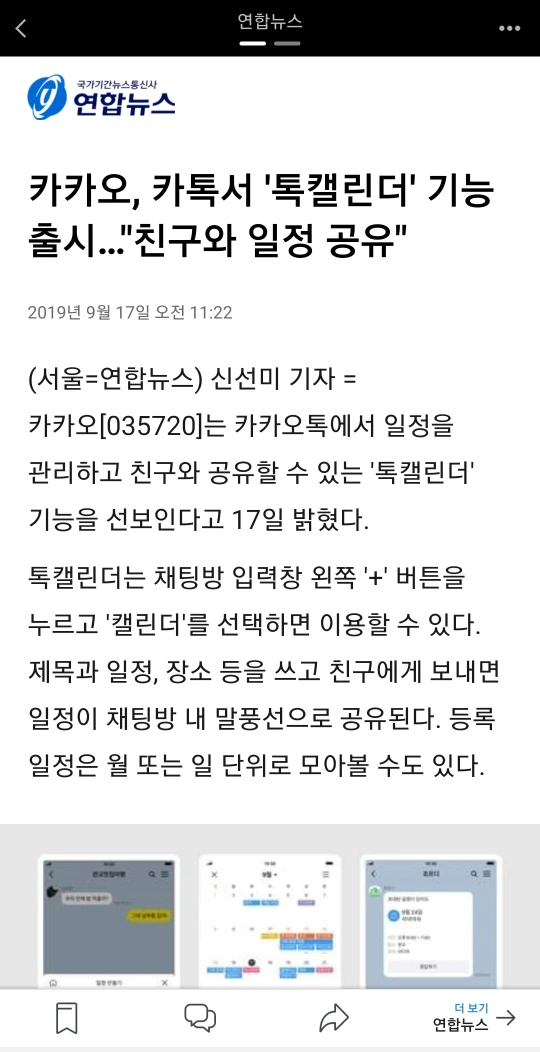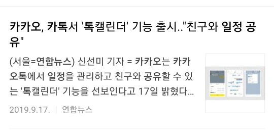 카카오, 카톡서 '톡캘린더' 기능 출시.."친구와 일정 공유" (서울=연합뉴스) 신선미 기자 = 카카오는 카카오톡에서 일정을 관리하고 친구와 공유할 수 있는 '톡캘린더' 기능을 선보인다고 17일 밝혔다. 톡캘린더는 채팅방 입력창 왼쪽 '+' 버튼을 누르고 '캘린더'를 선택하면 이용할 수 있다. 제목과 일정, 장소 등을 쓰고 친구에게 보내면 일정이 채팅방 내 말풍선으로 공유된다. 등록 일정은 월 또는 일 단위로 모아볼