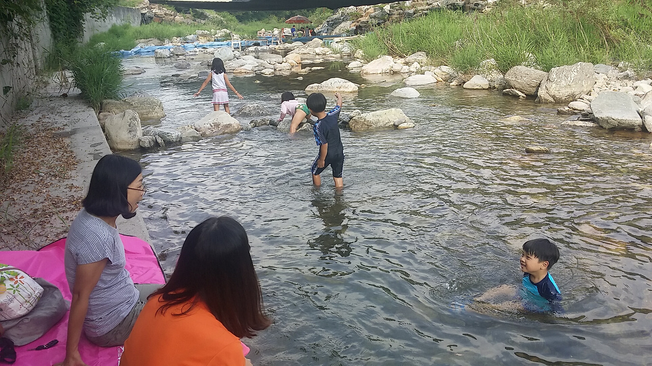 처음있는 장소보다 더 위로 물 따라 올라가니 어른 어깨 높이 깊이의 물이 있었다. 아이들은 이제 튜브를 타고 논다. 발장구와 수영이다
