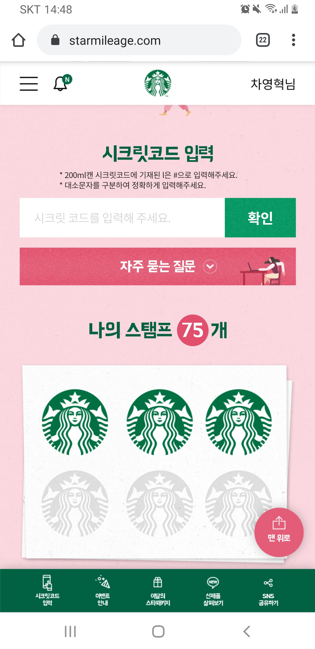 스타벅스 RTD STAR MILEAGE EVENT 스타벅스,시크릿코드위치,스타마일리지,이벤트,넥밴드 | 2019 스타벅스RTD 편의점에서 간만에 스벅 병 음료이다. 스타벅스 넥밴드 시크릿코드 얼마만인가? 병 껍질 안쪽의 정보를 찾기 힘들었다. 눈도 침침해서인지 코드도 잘 분간되지 않았다. 시크릿코드가 어디 있는지 홈피에 잘 설명되어 있다. https://www.starmileage.com/ 간만에 로그인해서 들어오니 회원 재확인 시크릿코드 입력과 스탬프 참