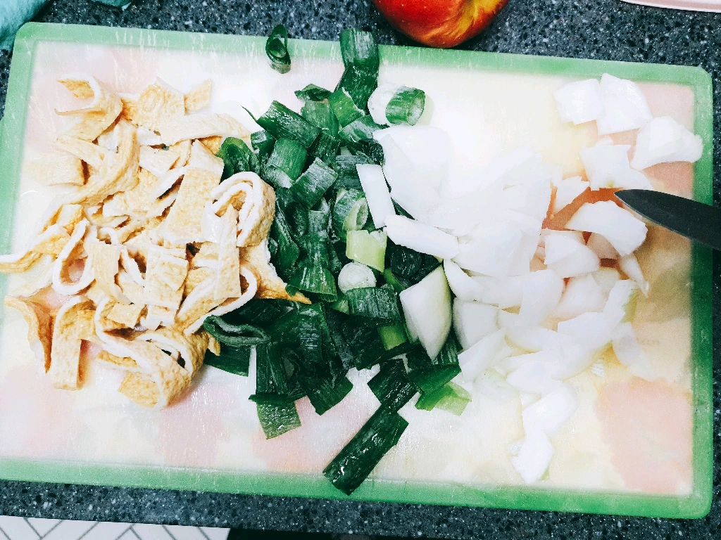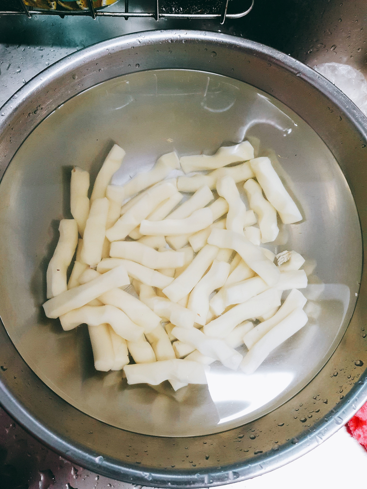 ① 떡을 물에 뿔린다. 그리고 냉장고의 가진 재료