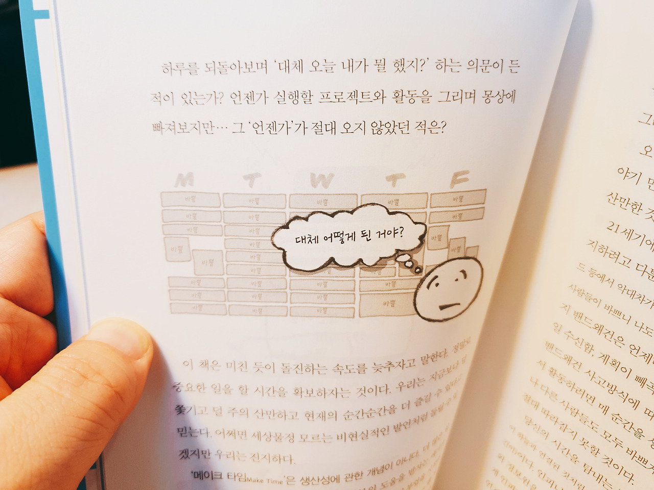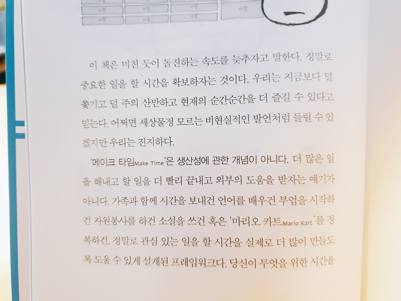 '메이크 타임 Make Time'은 생산성에 관한 개념이 아니다. 더 많은 일을 해내고 할 일을 더 빨리 끝내고 외부의 도움을 받자는 얘기가 아니다. 가족과 함께 시간을 보내건 언어를 배우건 부업을 시작하건 자원봉사를 하건 소설을 쓰건 혹은 '마리오 카트 Mario Kart'를 정복하건, 정말로 관심 있는 일을 할 시간을 실제로 더 많이 만들도록 도울 수 있게 설계된 프레임워크다.