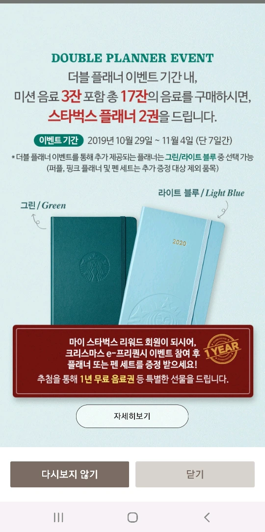 스타벅스 다이어리 더블플래너 1+1득템 스벅스벅하세요. 스타벅스, 스벅스벅하세요,다이어리,플래너,더블플래너,텀블러,숙대입구점 | 스벅스벅하세요. 2019 스벅 다이어리 득템기 올해도 역시 스타벅스 다이어리, 플래너를 빠른 러쉬로 득템한다. #스벅스벅하세요.스타벅스 다이어리 17잔 마셔서 득템하세요라는 느낌이다. 단순히 구매는 사절 한땀 한땀 모아서 숙대입구점에서 있었던 일 이른 아침에 텀블러로 차이티 라떼 한잔, 그리고 e-프리퀀시을 여동생에게 공수 양동작전 11월1일까지 미션음