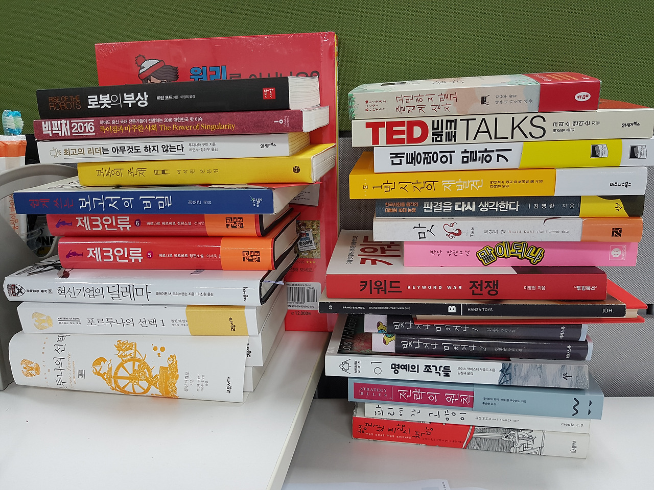 회사 책상 위에 쌓아노은 책들 중에 한 권을 들고 퇴근한다.