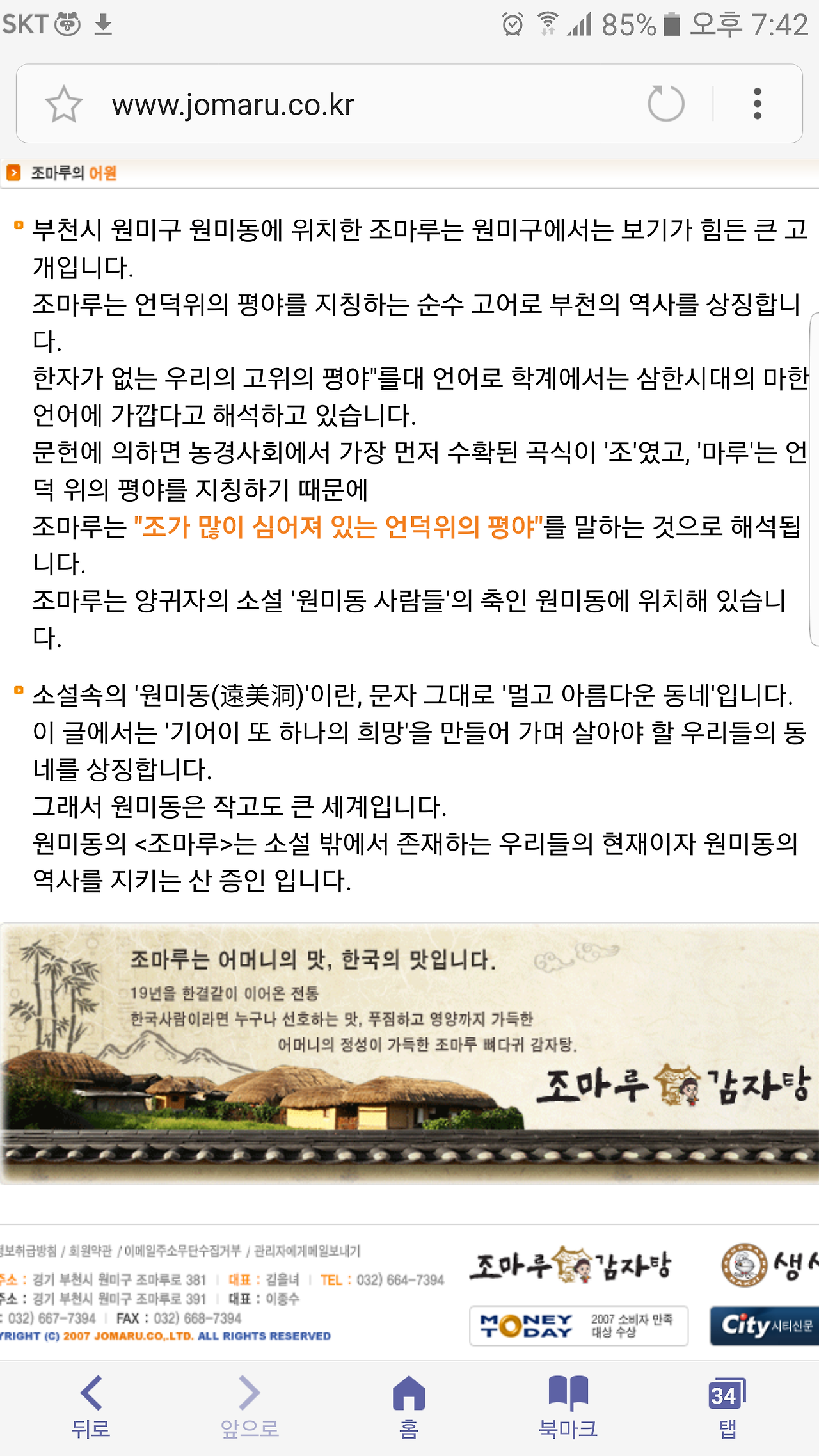 부천 조마루길에서 1989에 시작 된 프랜차이즈로 험페이지에 보니 조마루 뼈다귀 가맹점이 2011년에 220호점에 돌파했고, 중국에도 진출을 했단다.