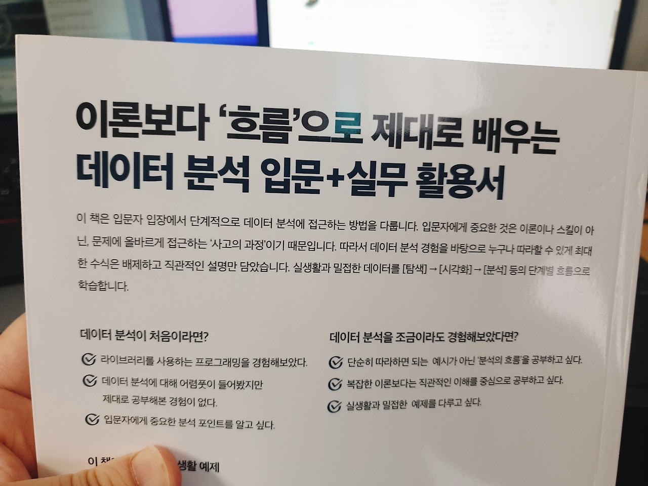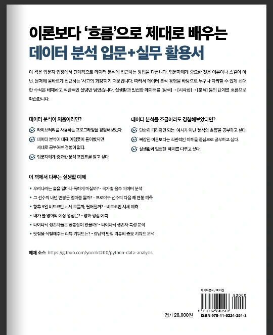 입문자 입방에서 단계적으로 데이터 분석에 접근하는 방법을 다루며, 사고의 과정을 중요시하여 데이터 분석 경험을 바탕으로 누구나 따라 할 수 있게 직관적인 설명을 담았다고 한다.