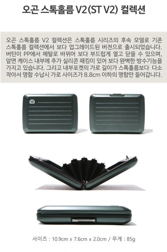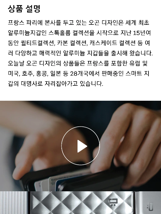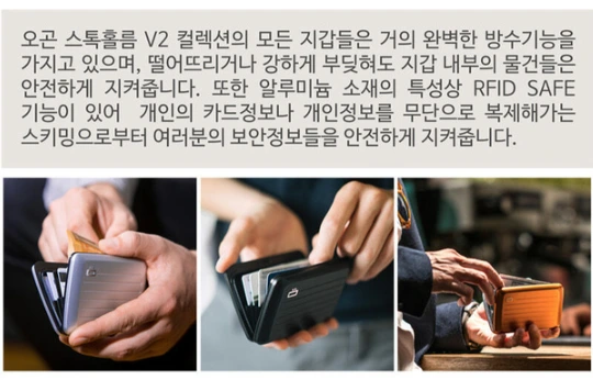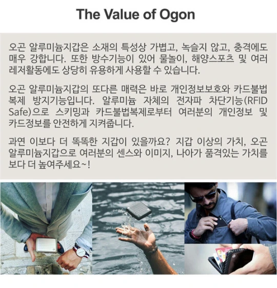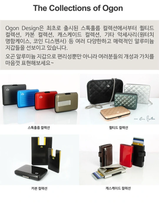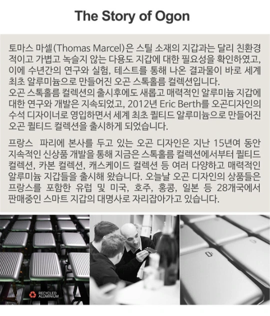 오곤 알루미늄지갑 스톡홀름V2(블랙) 프랑스 파리에 본사를 두고 있는 오곤 디자인은 세계 최초 알루미늄지갑인 스톡홀름 컬렉션을 시작으로 지난 15년여 동안 퀼티드컬렉션, 카본 컬렉션, 캐스케이드 컬렉션 등 여러 다양하고 매력적인 알루미늄 지갑들을 출시해 왔습니다. 오늘날 오곤 디자인의 상품들은 프랑스를 포함한 유럽 및 미국, 호주, 홍콩, 일본 등 28개국에서 판매중인 스마트 지갑의 대명사로 자리잡아가고 있습니다.