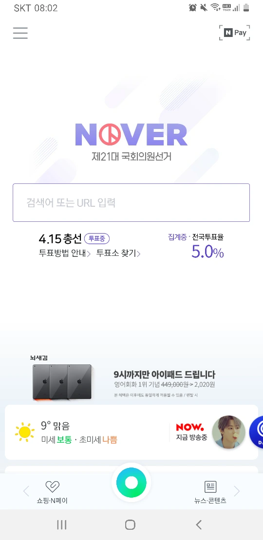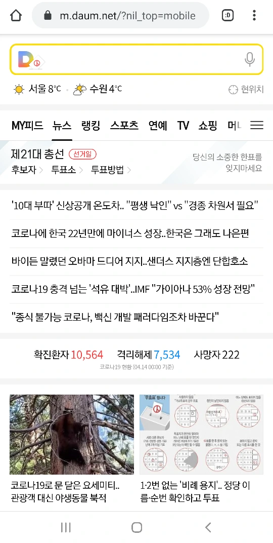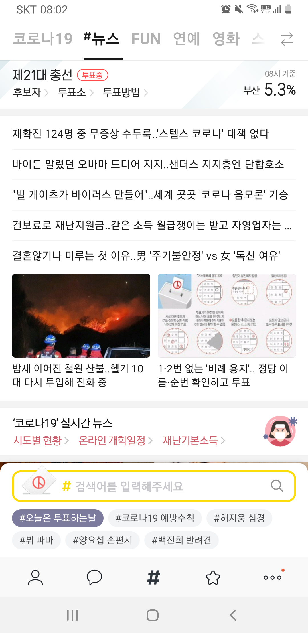 일찍 일어나서 선거정보를 확인하고 투표를 하고 옵니다. 개표소 바닥에 녹색 스티커를 붙여 줄 간격을 유지하고 앞에서부터 인원 관리를 하고 있었습니다. 거기에 손세정제에 비닐장갑까지 그렇게 투표가 진행 중이었습니다. 비닐장갑은 쪼매 불편했습니다.현재 시간 기준 5%대라고 한다.