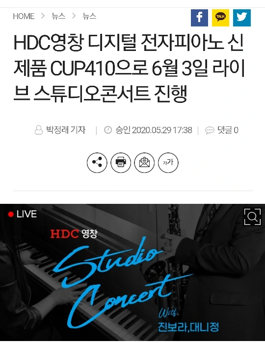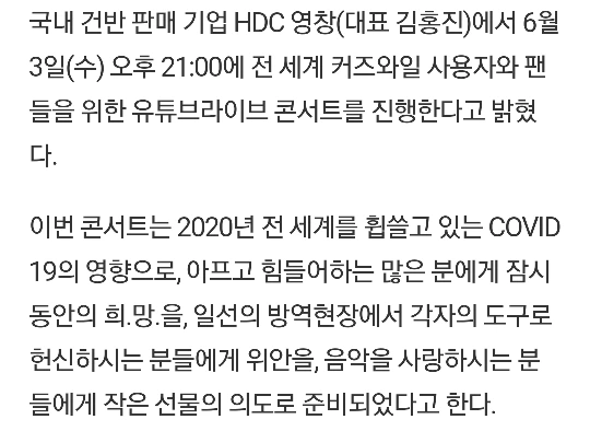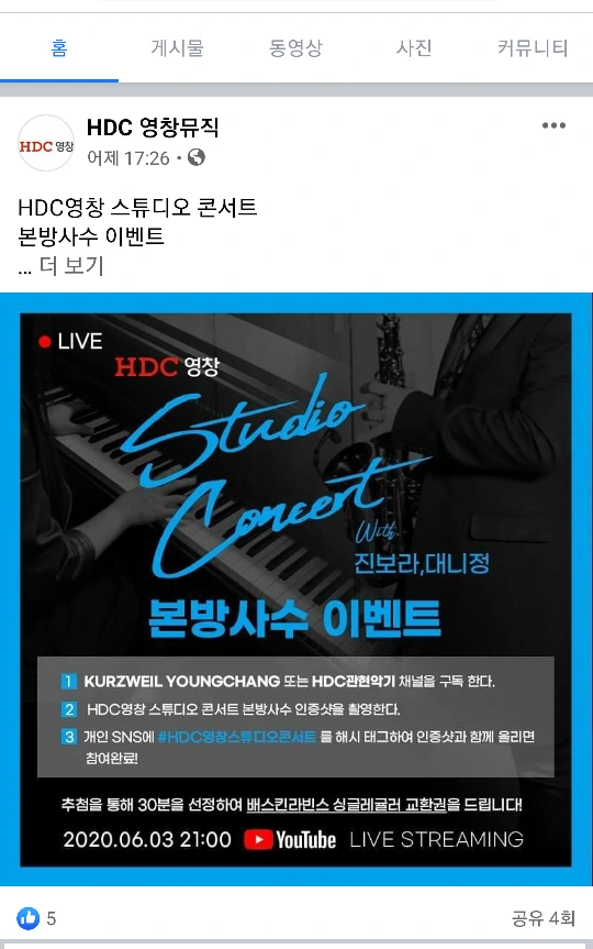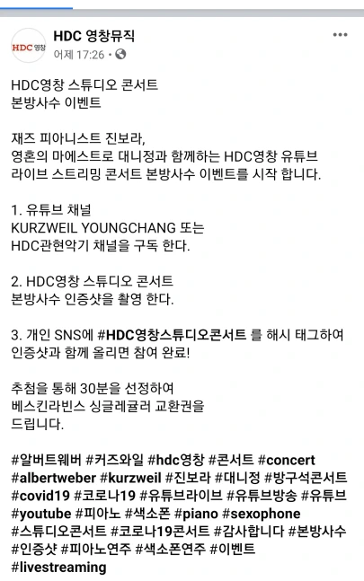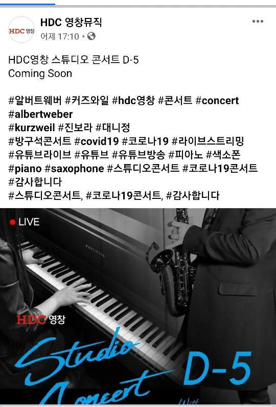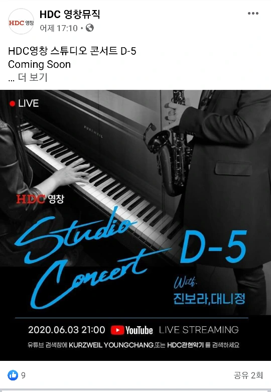 국내 건반 판매 기업 HDC 영창(대표 김홍진)에서 6월 3일(수) 오후 21:00에 전 세계 커즈와일 사용자와 팬들을 위한 유튜브라이브 콘서트를 진행한다고 밝혔다.이번 콘서트는 2020년 전 세계를 휩쓸��