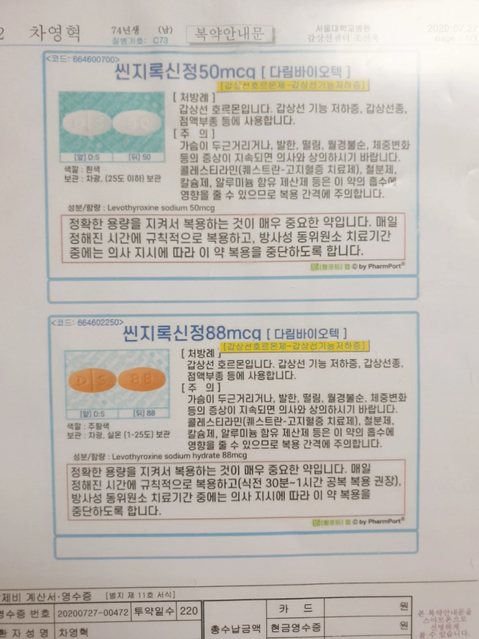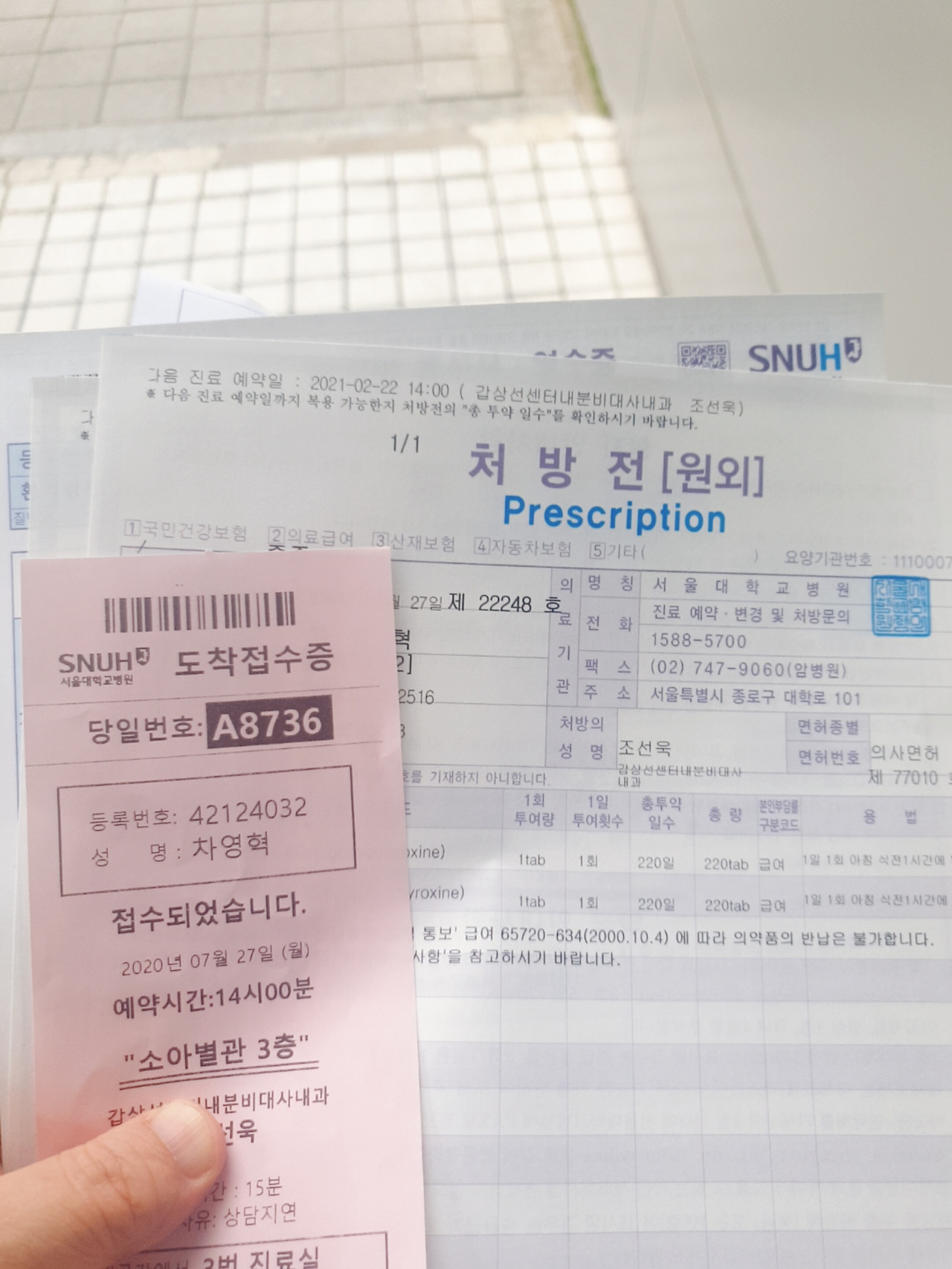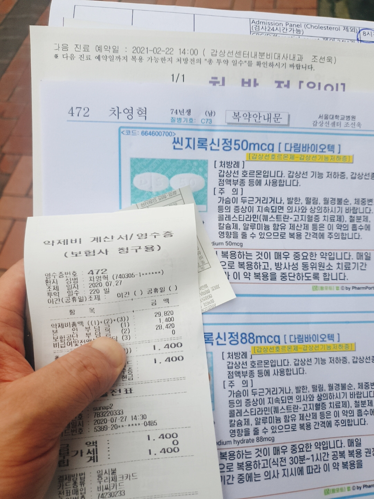 갑상선 검사6개월에 한 번씩 서울대병원을 찾습니다.나름 약의 양이 줄고 있습니다.좋은 징후입니다.갑상선을 다 떼어 냈지만 약으로 연명하고 있답니다.이제는 새벽 빈속에 약 먹는 것이 일상이 되었습니다.6개월마다 병원을 찾는 것 또한