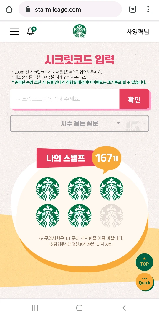 시크릿 코드를 모으면 스타벅스 MD가 내손에!