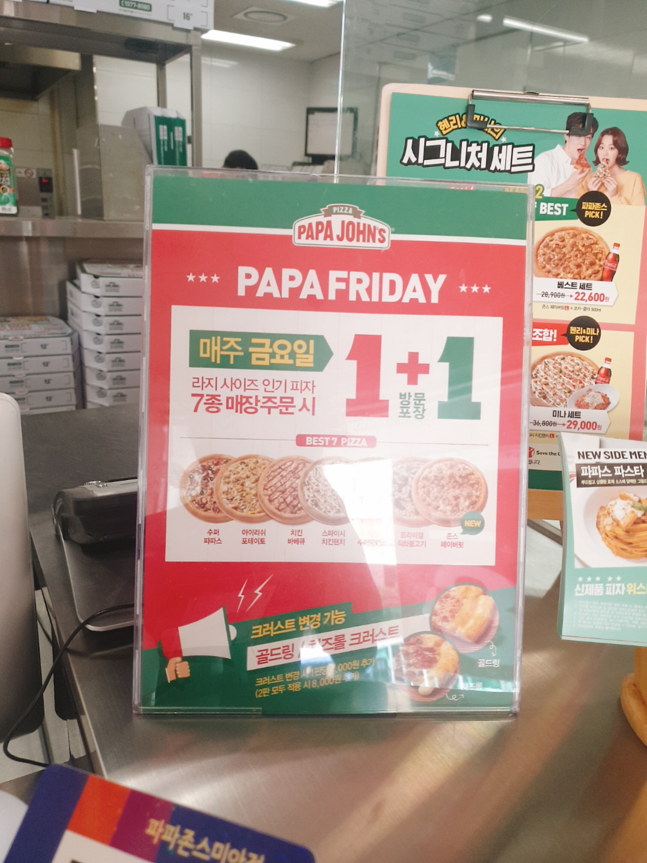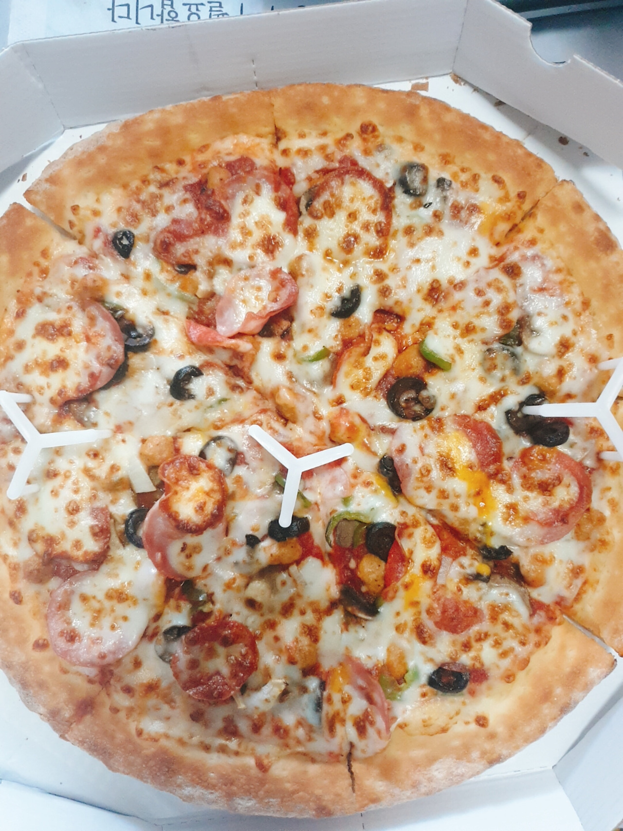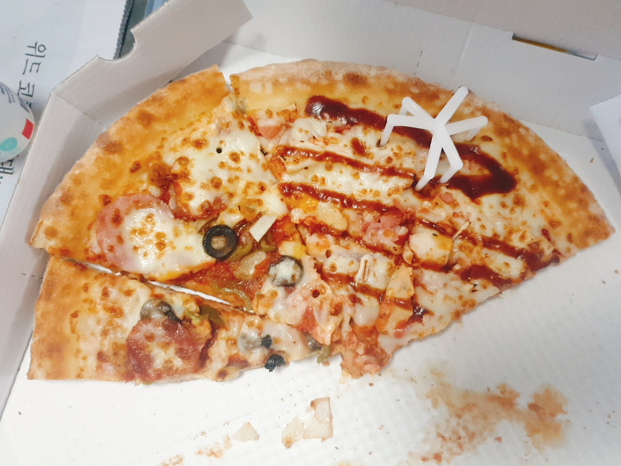 금요일과 피자아이들의 칭찬 스티커 30개 모으면, 여러 가지 선물 쿠폰이 있는데 그중에 치킨과 피자가 있었습니다.그래서 피자를 먹습니다. 1+1맛나게 먹었습니다.