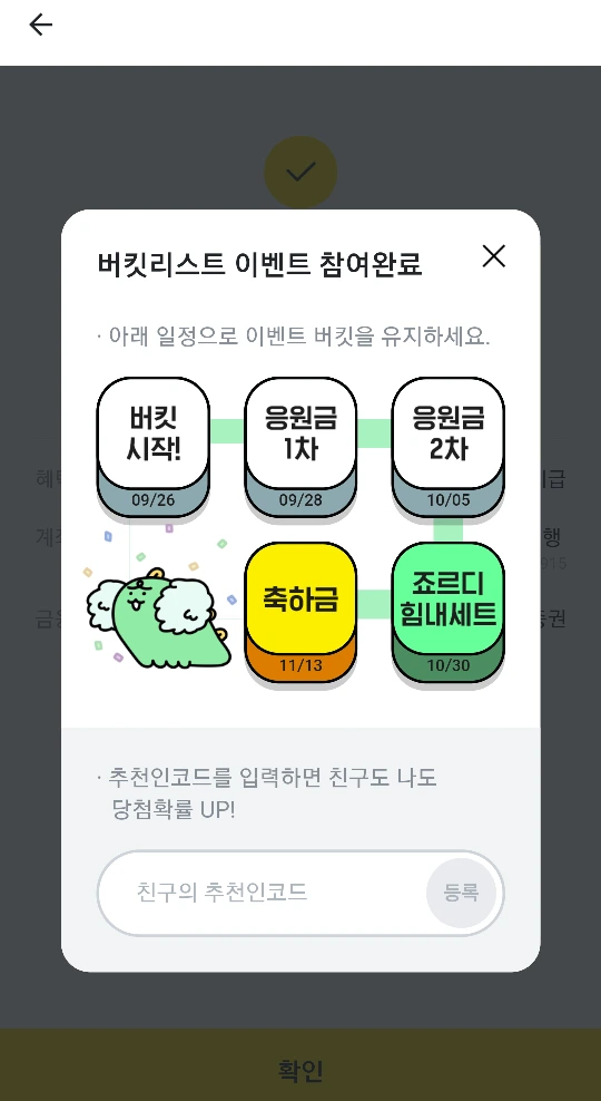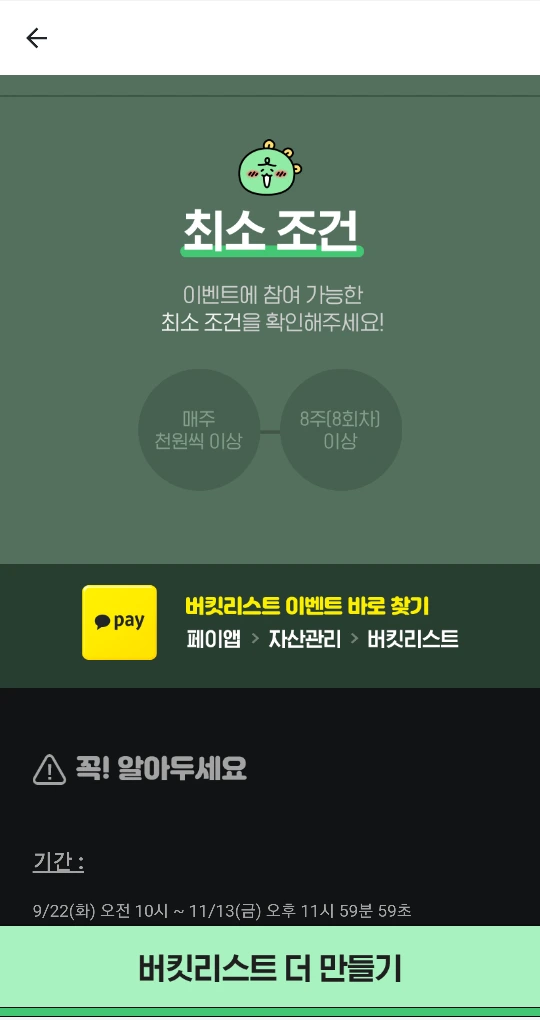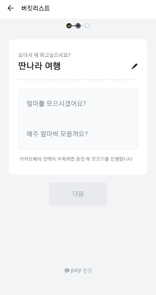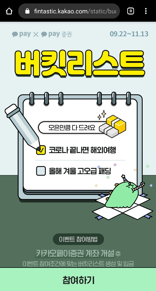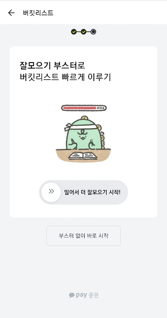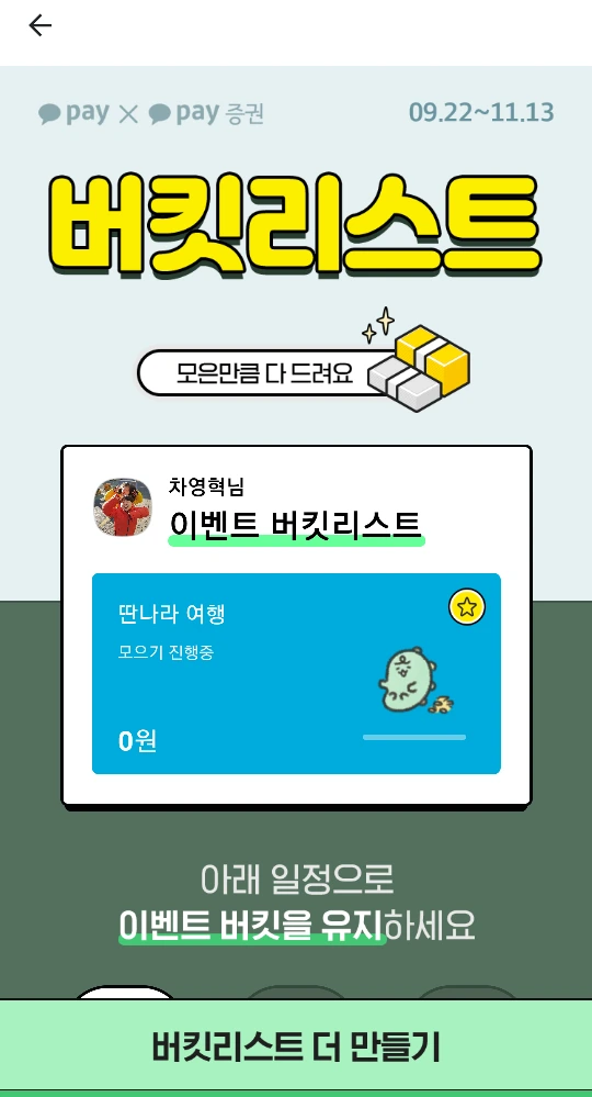 버킷리스트 서비스하면 자연스레 증권계좌 생성카뱅의 26주 적금의 이벤트 성 달성 목표로 금융과 접목하는 방식은 남다릅니다. 기간이 생각보다는 길긴 해도 시도해 봅니다.기타 잔돈 투자, IT펀드 등도 잘 이용하고 있습니다.