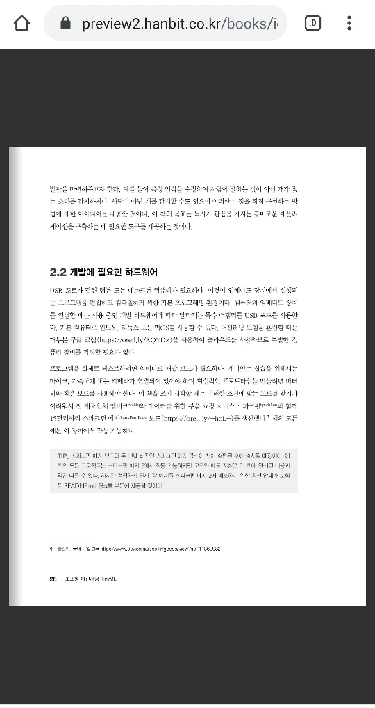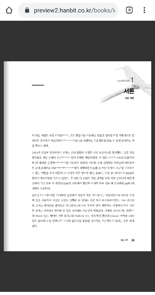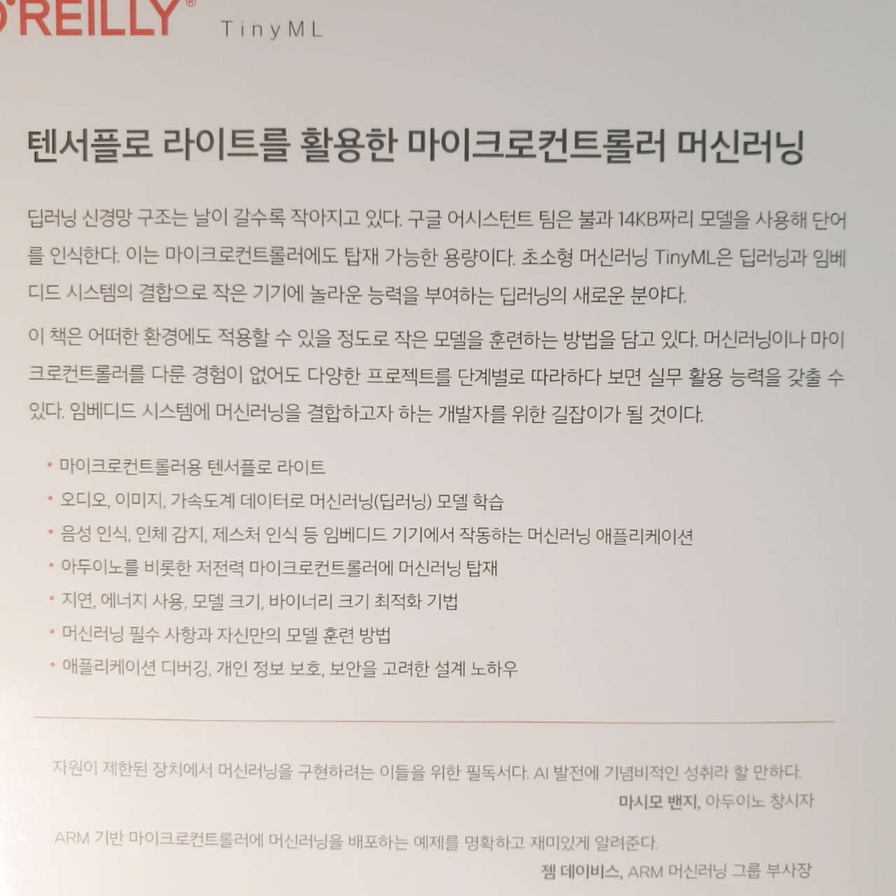 일단 하드웨이에 관심이 있는 분들에게는 놀라운 진일보한 책이다. 내 디바이스에서 딥러닝을 돌려본다. 그것도 순서에 입각해서 돌려보게 잘 정리가 되어 있는 것입니다. 최근에는 구글 코랩 Colab도 스마트폰에서 유연하게 돌릴 수 있는 세상입니다. 출퇴근 지하철에서 몇 줄 코딩으로 딥러닝을 돌린다는 겁니다. 딥러닝의 저변 확대는 곧 Iot로 더 빠른 시간으로 다가올 것입니다. 쉽게 접할 수 없는 분야를 이렇게 잘 정리된 책으로 접해봅니다.