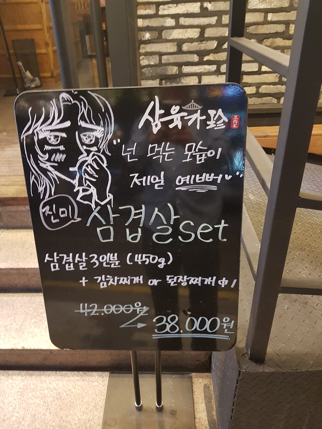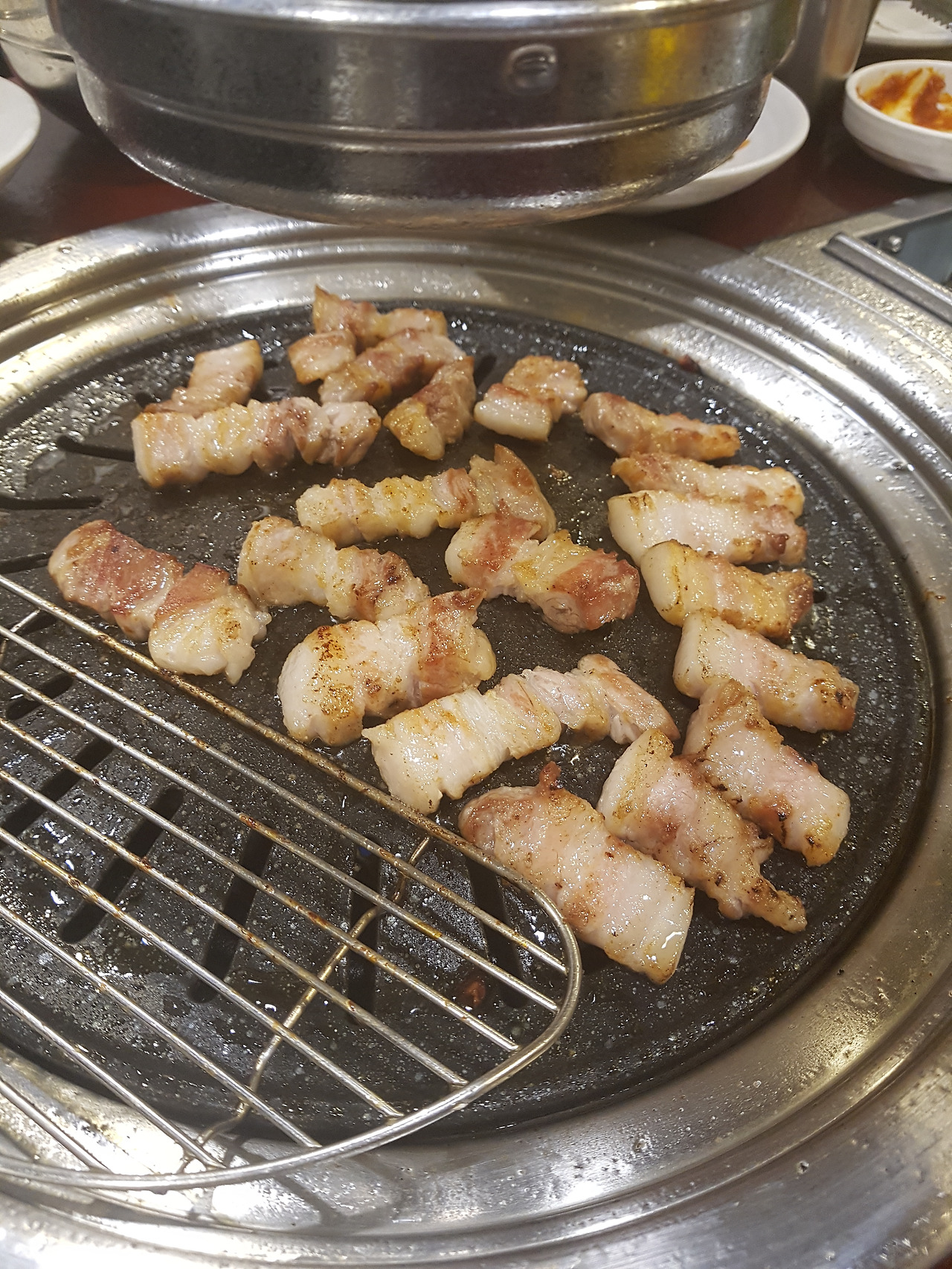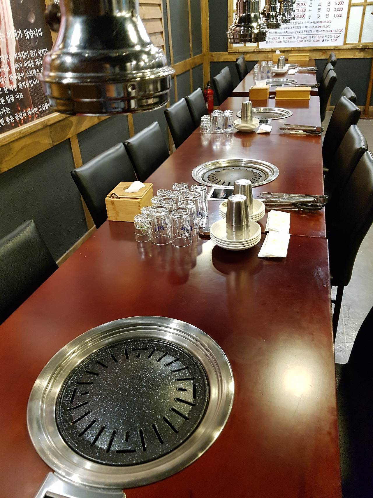 아무도 밥을 시키지 않았기에 밥 없이 회식이 끝났기 때문이다. 셋트 메뉴를 시키면 된장이나 김치를 2,000원에 먹을 수 있다고 하여 공기밥 없이 고기와 찌개로 시작한 것이 주요했다.