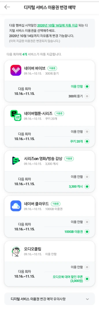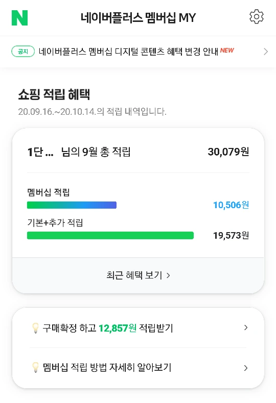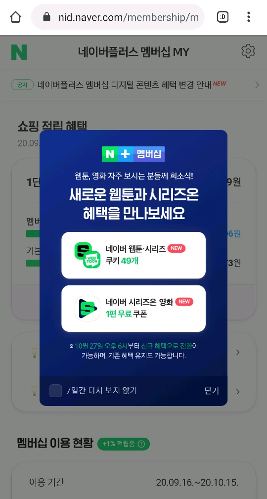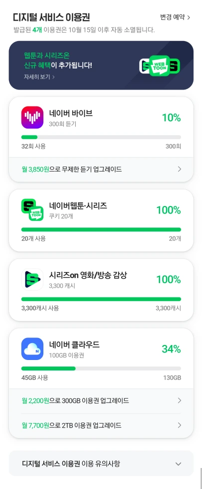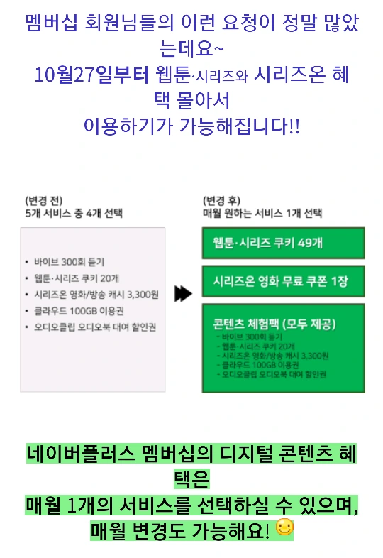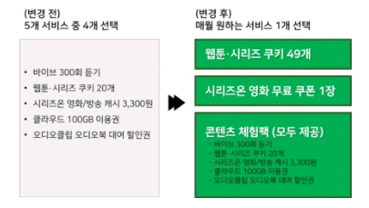 나름 월 4,900원으로 두루두루 사용합니다.덕분에 네이버 통장도 만들고, N쇼핑라이브에 일부 콘텐츠 소비까지 출퇴근길이 알차졌습니다.쇼핑이 엄청 는 것도 사실입니다. 택배박스가 쌓입니다.그리고 콘텐츠 강화 추가 혜택까지, 서비스 개편되면 그때 가서 골라 볼 생각입니다.저는 이것저것이 스타일이라 기존 체험팩을 계속하지 않을까 합니다.