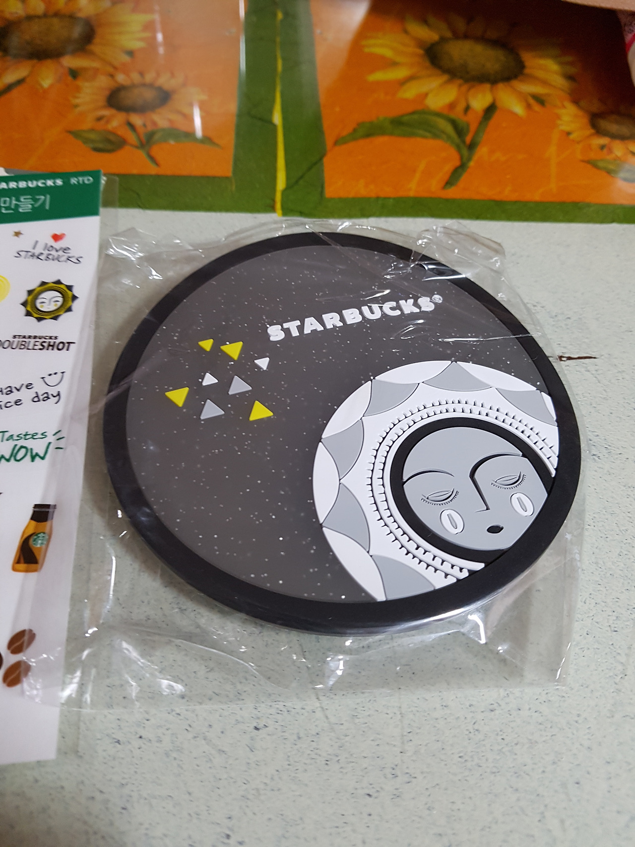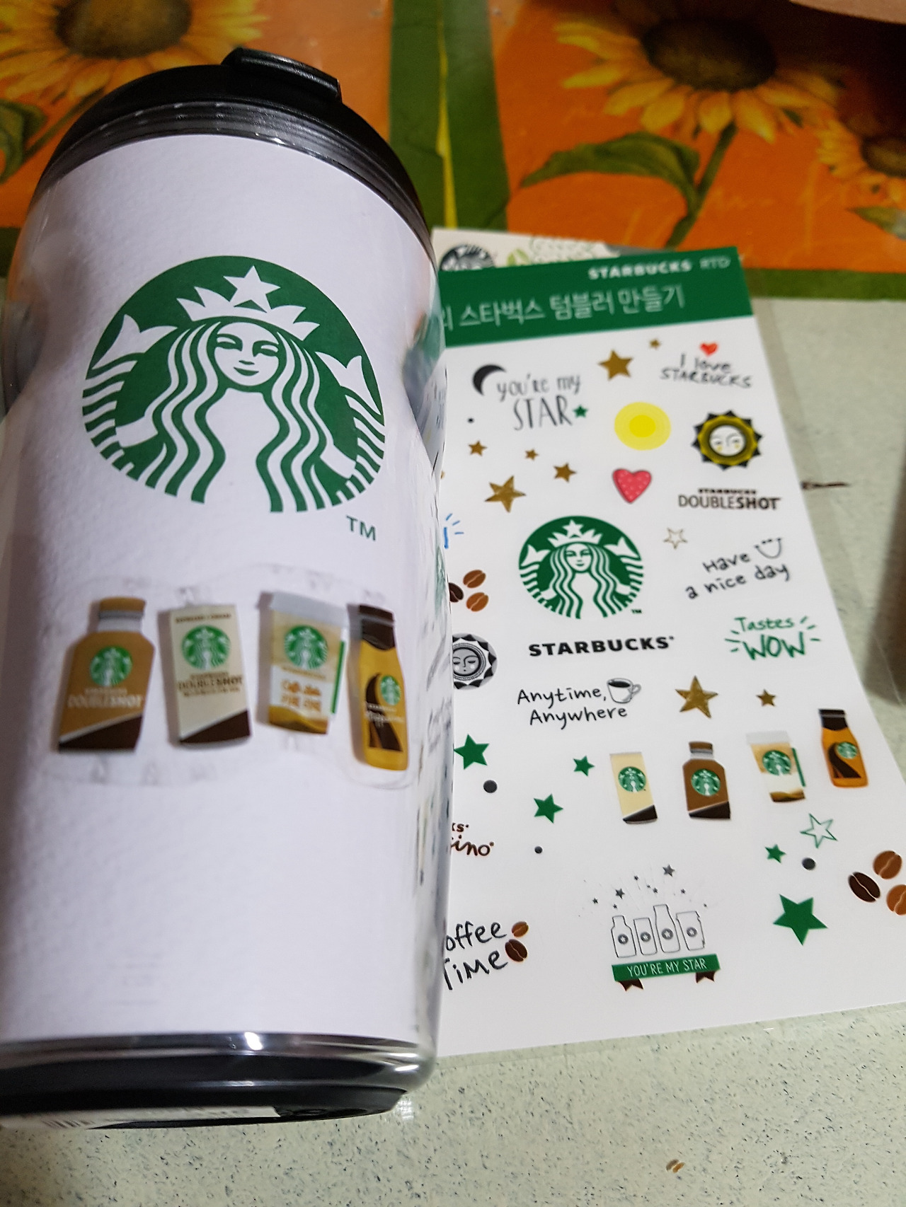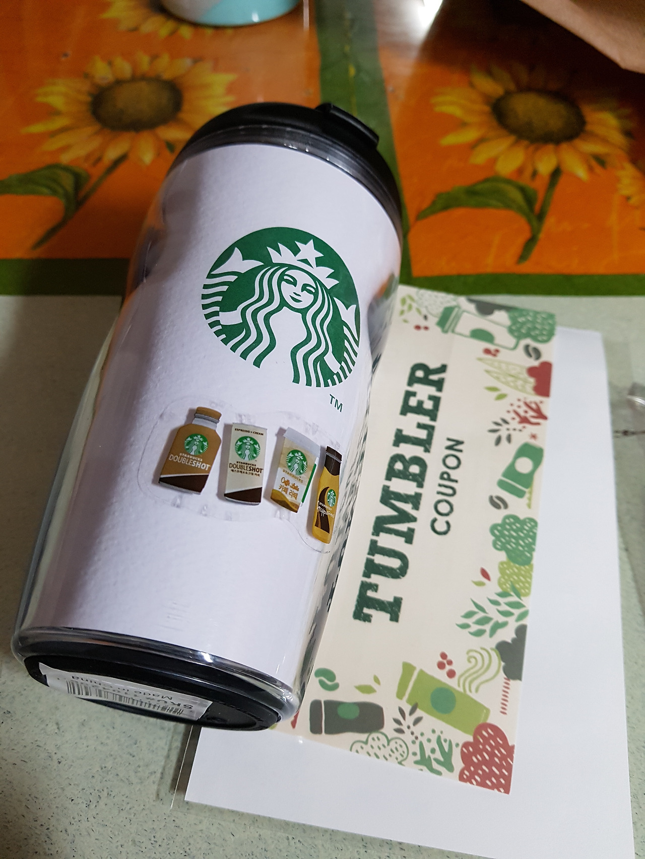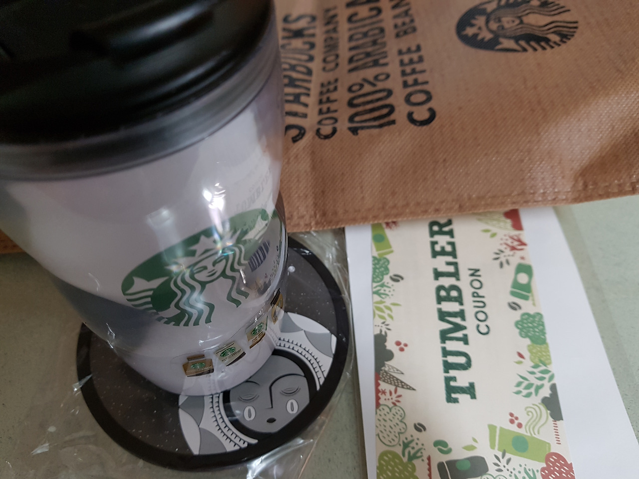 미니텀블러에 스티커, 받침대, 커피쿠폰, 선물봉투 나쁘지 않다. 스티커는 자신만의 텀블러로 꾸미기 위함이다.