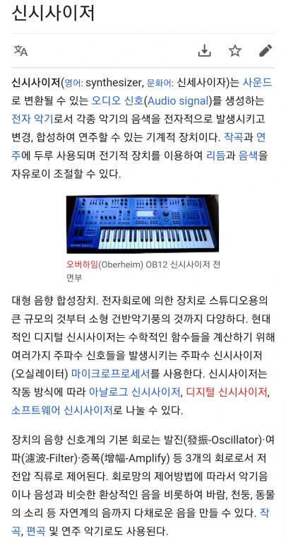 사운드로 변환될 수 있는 오디오 신호를 생성하는 전자악기로서 각종 악기의 음색을 전자적으로 발생시키고 변경, 합성하여 연주할 수 있는 기계적 장치